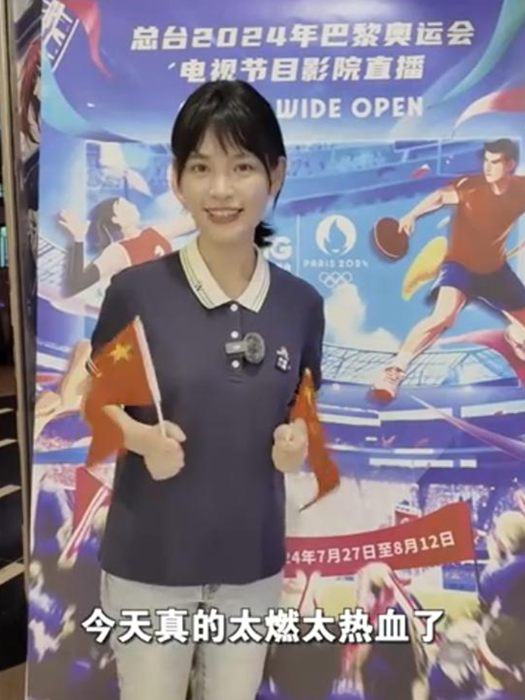 两条短视频共同的制作特色在于使用了空间并置的手段。运动员和影院观众“同时而不同在”,往往成为短视频调动受众情感认同的难点所在。视频把银幕上播放的比赛画面放置在竖屏构图的上方,把观众的现场反应置于下方,通过上下分屏的实时对照打破了空间上的物理区隔--让赛事空间与影院空间深度融合,形成了一个高度类似赛事现场转播的视知觉效果。在这一氛围中,运动员的精彩表现与观众挥舞国旗和呐喊加油的互动效果套嵌在一起,产生了“不在赛场胜似现场”的沉浸式互动感,这让广大受众的情感认同被充分激发出来。