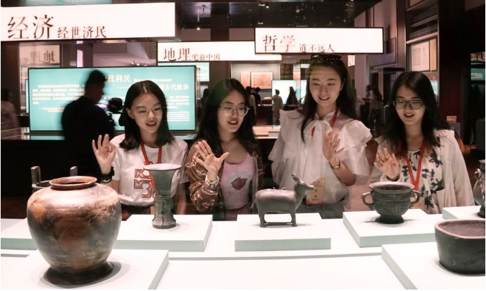 8月24日,参加第三十届海峡两岸大学生新闻营的师生们在北京中国国家版本馆参观。新华社记者 李欣 摄