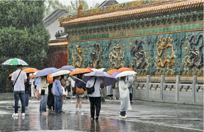 不期而遇的雨中故宫,显得很特别。太和殿前,雨水从一处处螭首形的孔洞排出,形成“千龙吐水”奇观。古人精妙的排水系统至今仍在发挥功用,让在场的年轻人发出赞叹。