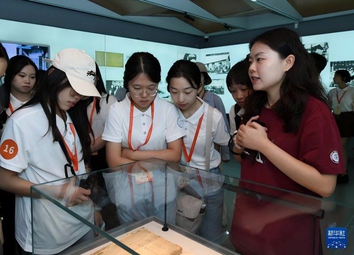 8月28日,在北京大学校史馆,讲解员(右一)为参加第三十届海峡两岸大学生新闻营的学生们讲解。