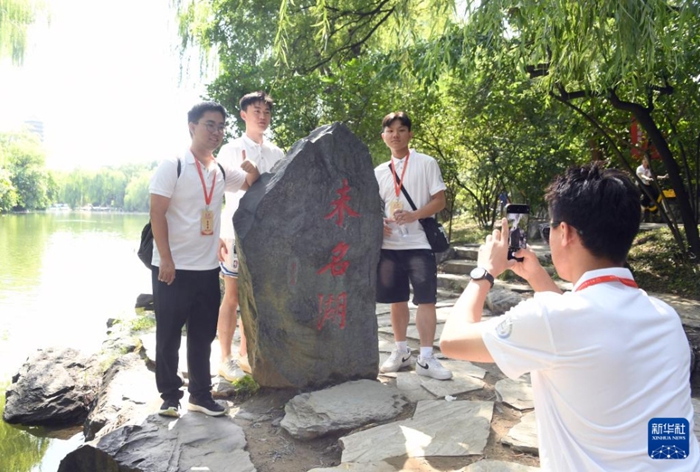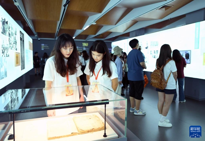 8月28日,参加第三十届海峡两岸大学生新闻营的学生们在北京大学校史馆参观。
