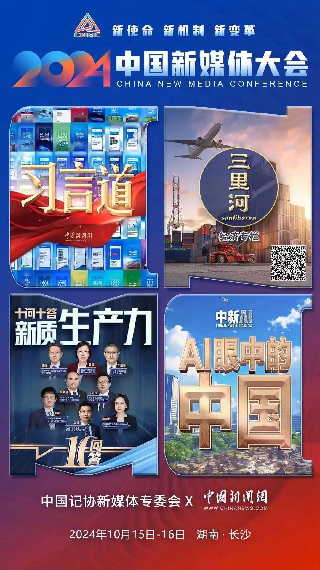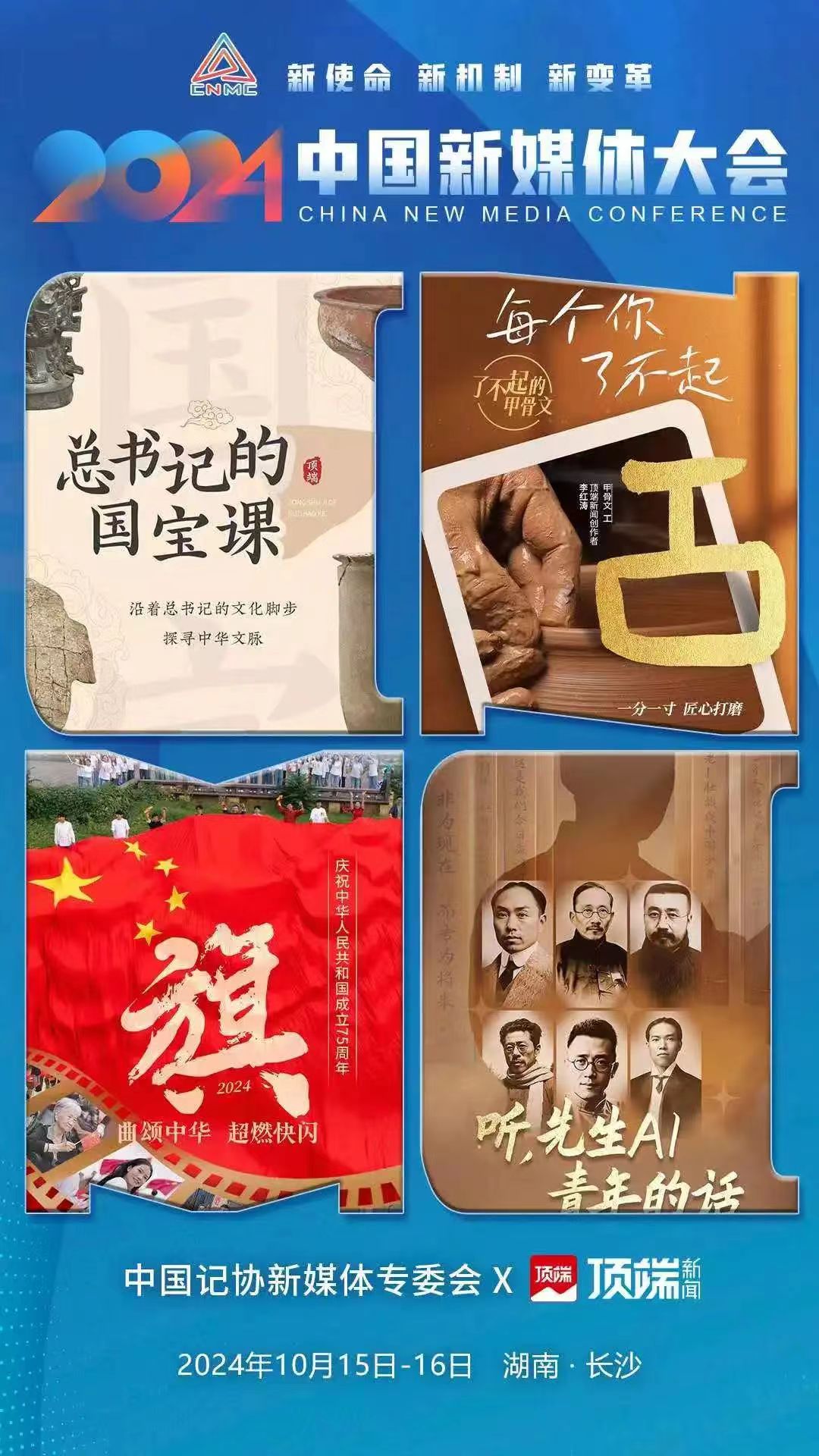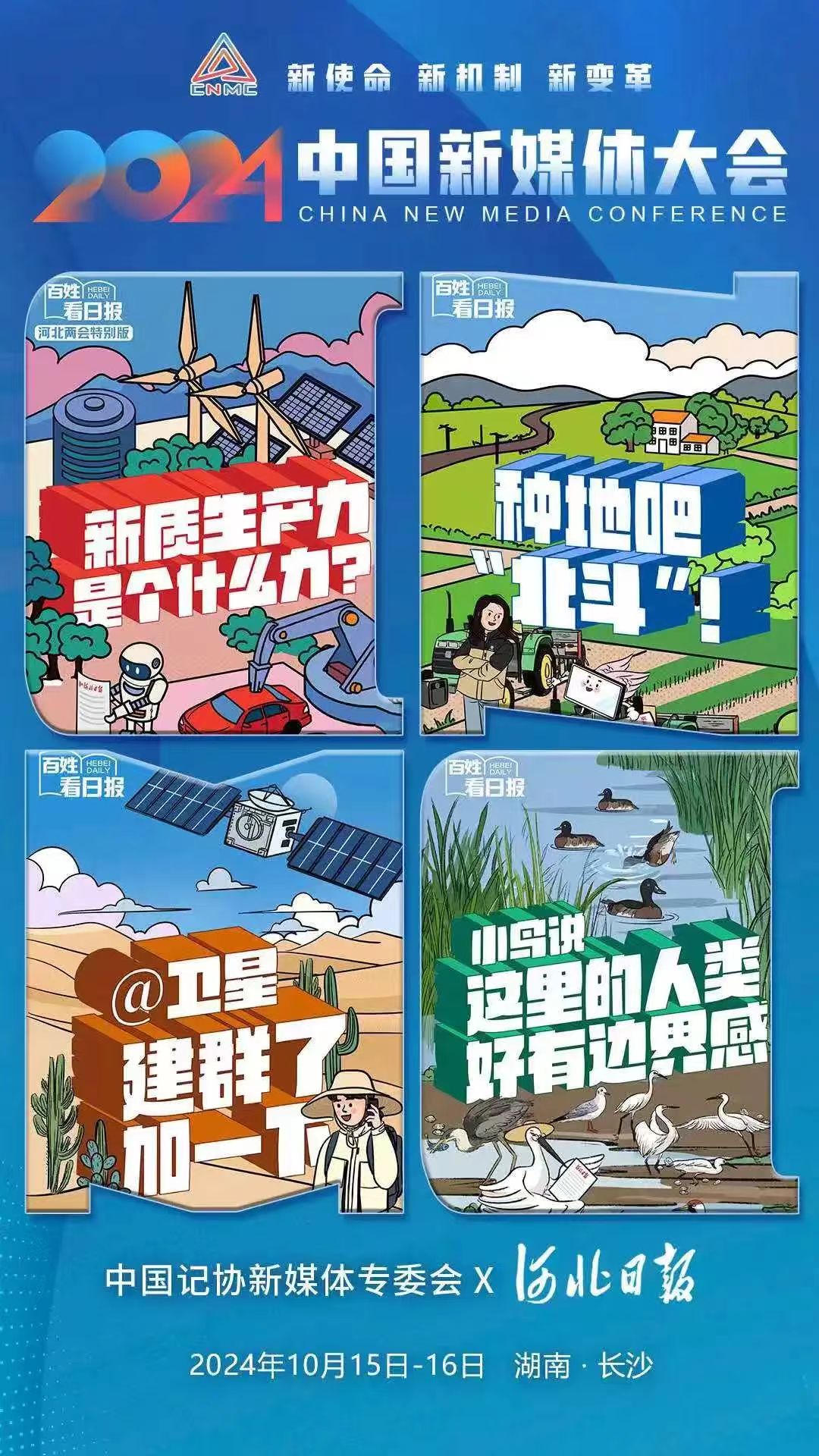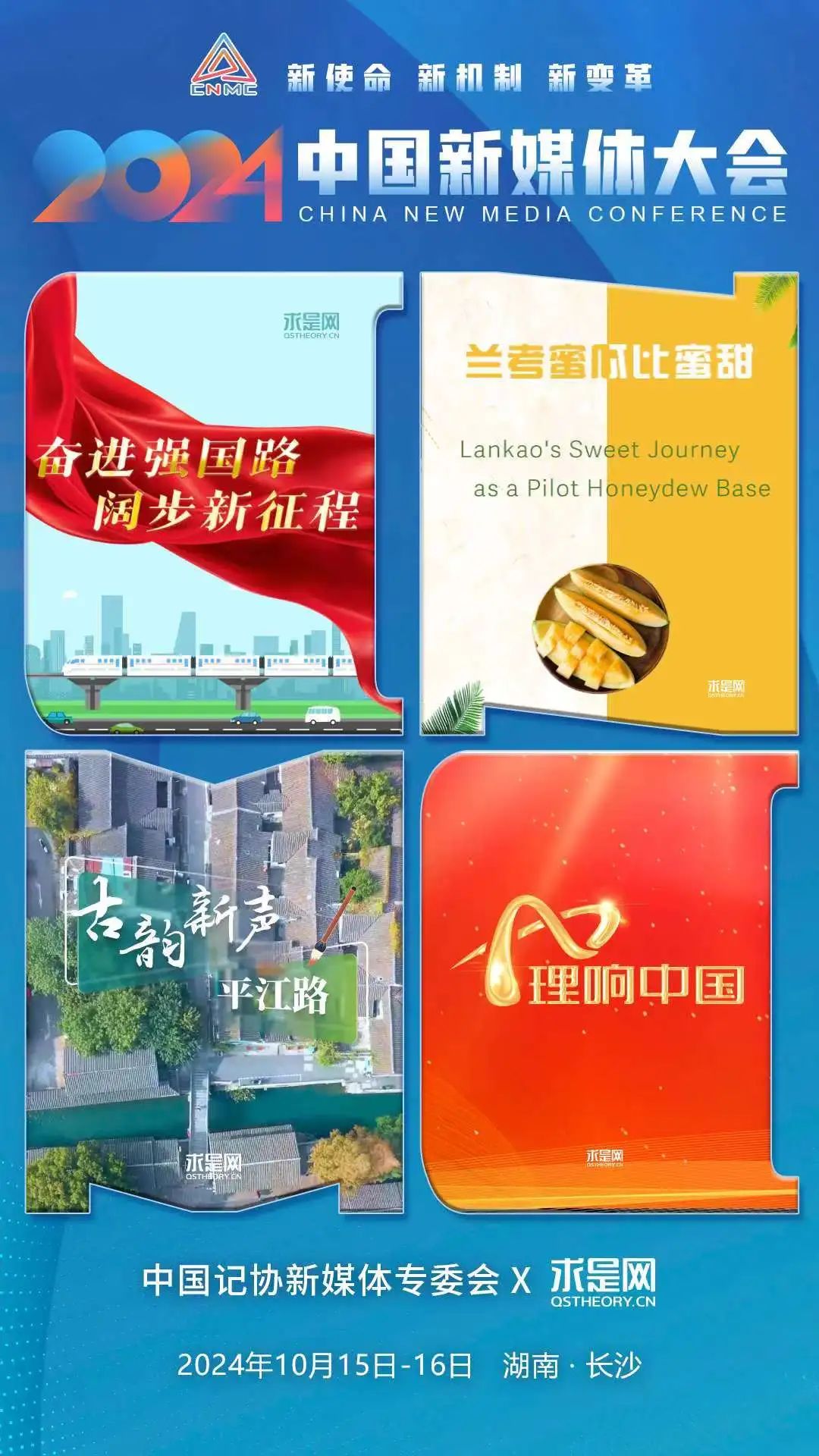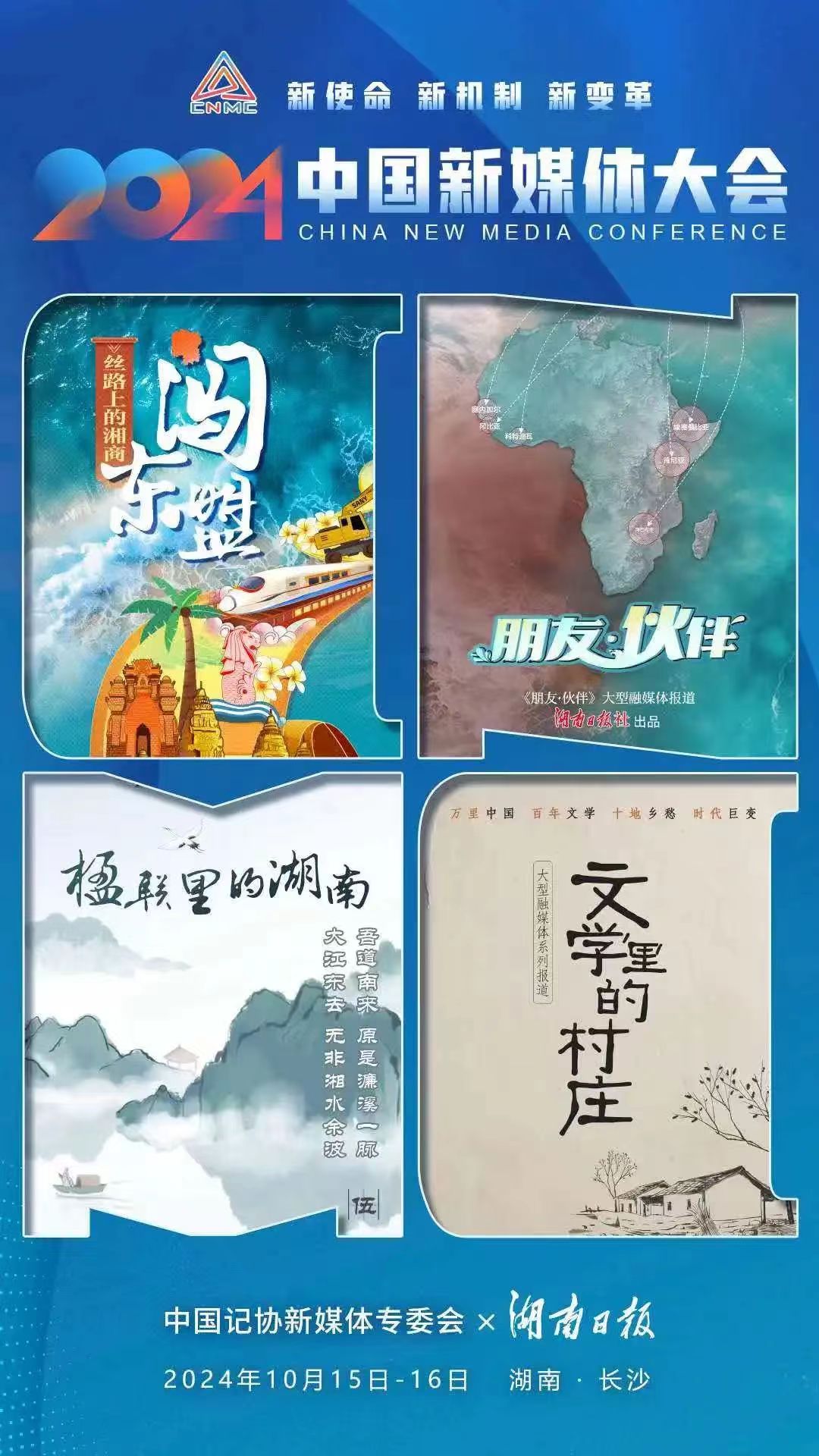2024中国新媒体大会将于10月15日至16日在湖南长沙召开,中国记协新媒体专业委员会各成员单位纷纷推出“联名海报”为大会预热。