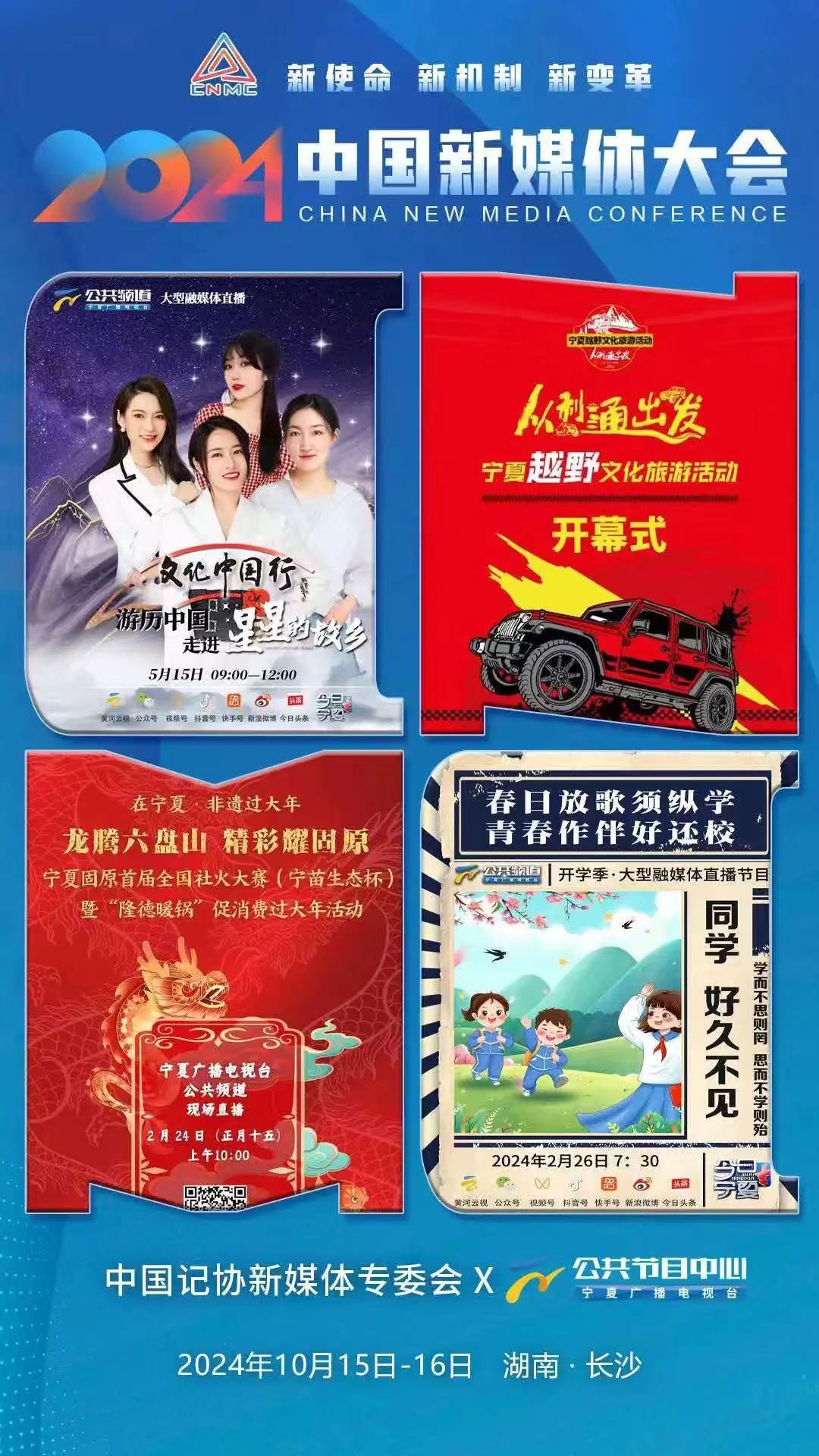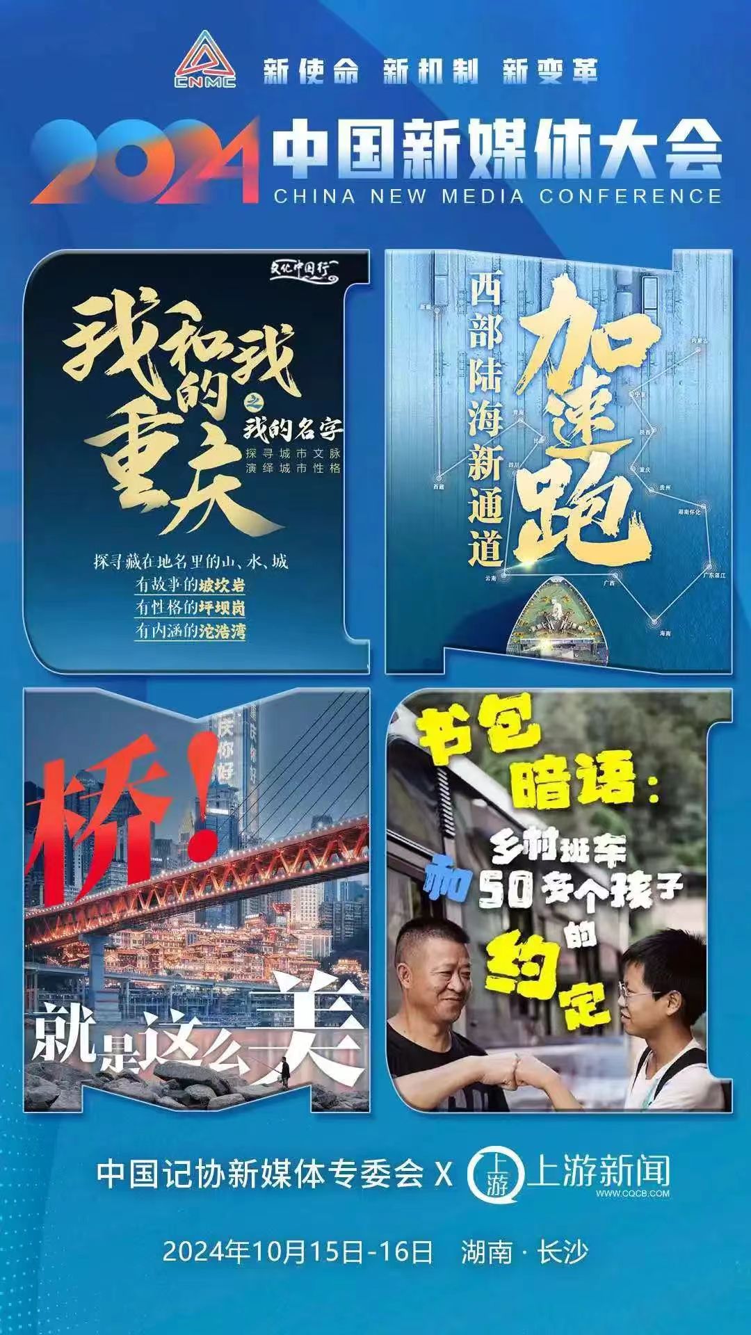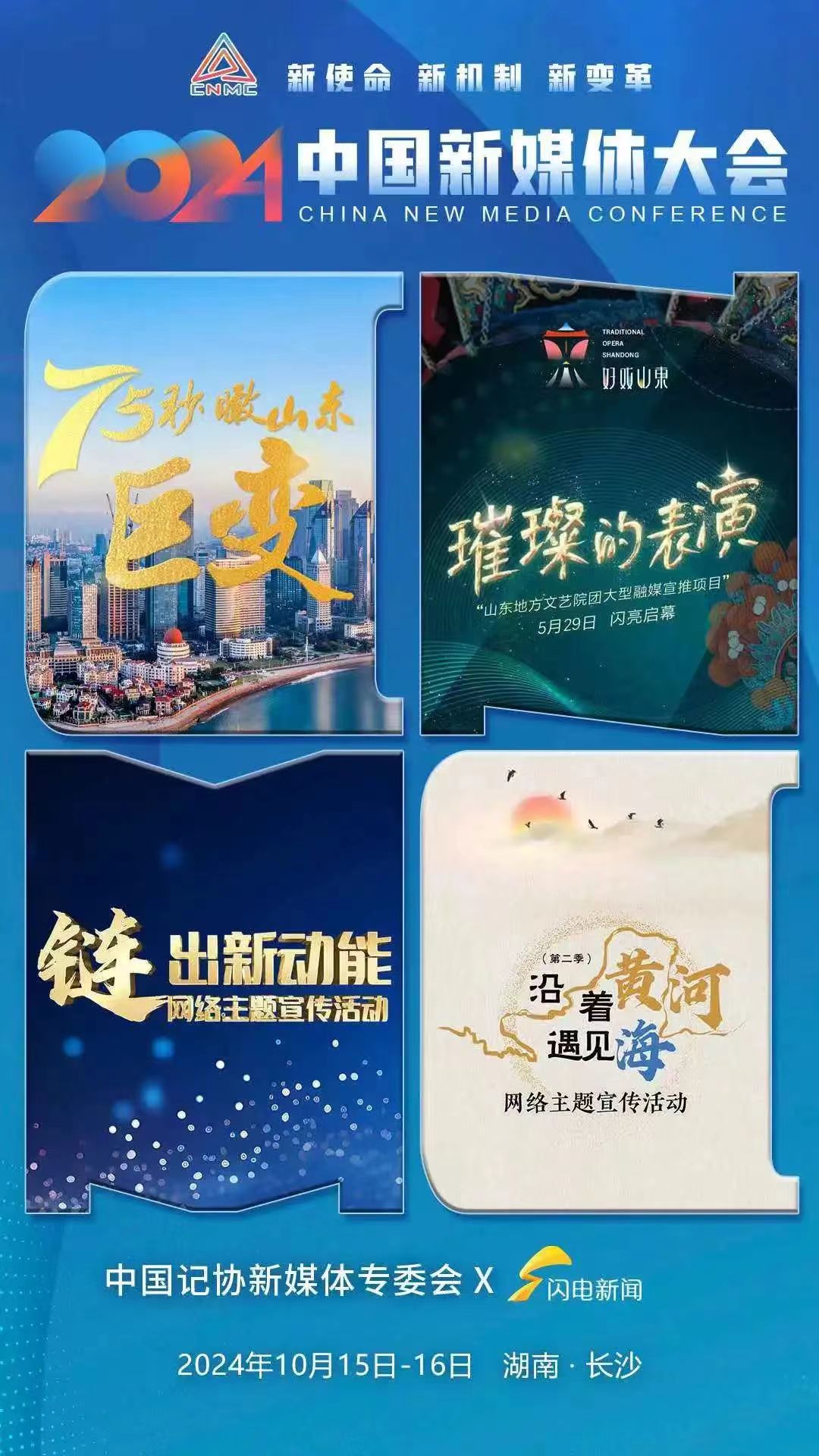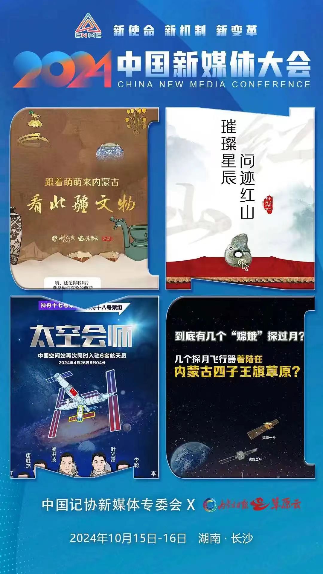 2024中国新媒体大会将于10月15日至16日在湖南长沙召开,中国记协新媒体专业委员会各成员单位纷纷推出“联名海报”为大会预热。