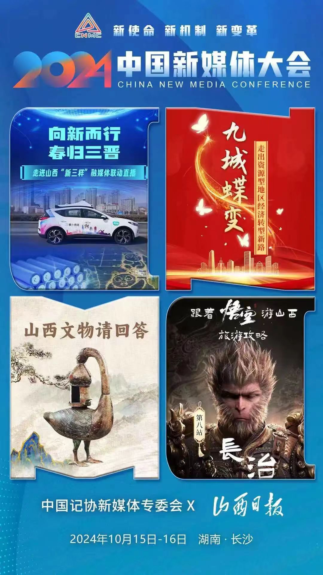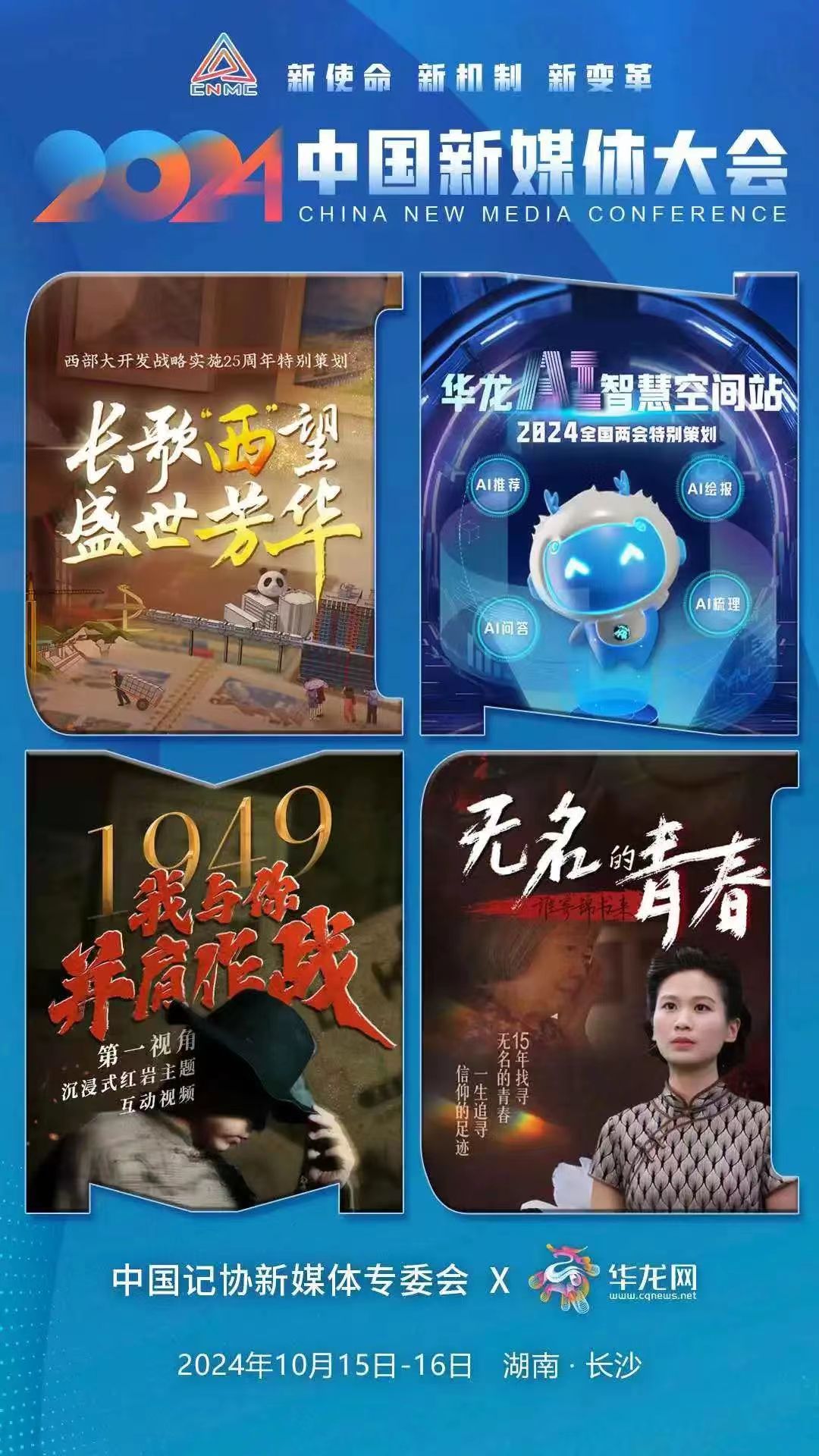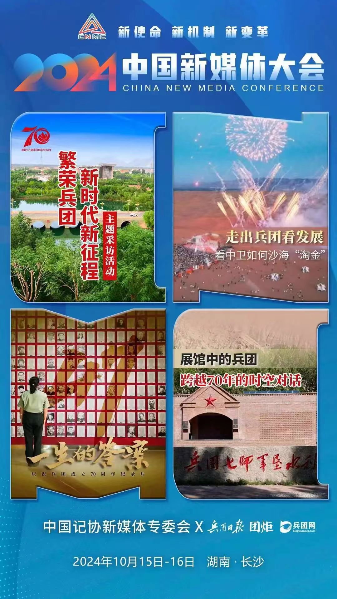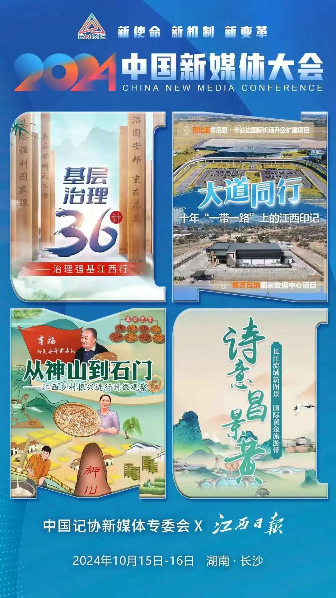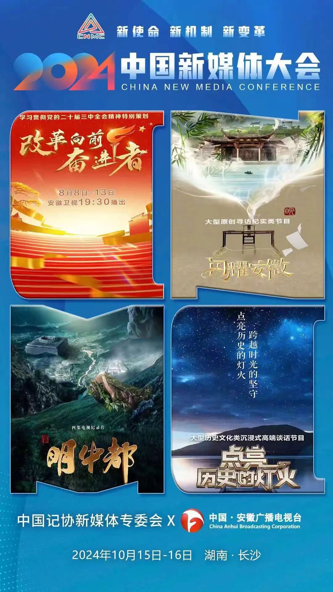 2024中国新媒体大会将于10月15日至16日在湖南长沙召开,中国记协新媒体专业委员会各成员单位纷纷推出“联名海报”为大会预热。