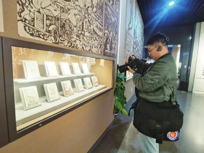 见记者看得入神,山西广播电视台记者郝银东走过来,同行交流中“互采”起来。“在战火纷飞中出版不容易,收藏并流传下来就更珍贵了。今天我们看到这些书,也了解到八路军战士们的战斗、生活是怎样的。”他说,因工作需要经常来八路军太行纪念馆,今天却是第一次细细观看这一墙读物。