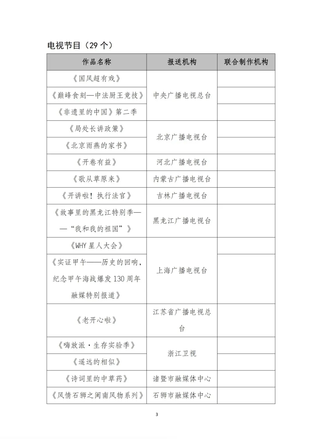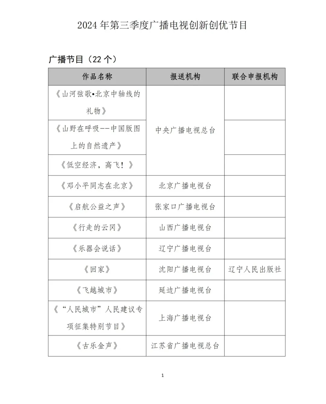 全国广播电视以习近平新时代中国特色社会主义思想为指导,认真学习贯彻习近平文化思想,深入贯彻落实党的二十届三中全会精神,不断加强优质内容供给,2024年第三季度创作播出了一批主题鲜明、内涵丰富、制作精良的广播电视节目,积极满足人民群众日益增长的精神文化需要。近日,广电总局组织专家评审,确定北京广播电视台《邓小平同志在北京》等22个广播节目、中央广播电视总台《国风超有戏》等29个电视节目为2024年第三季度广播电视创新创优节目。