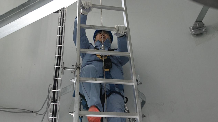 当10多斤重的安全装备穿在身上,心里总算鼓起了一丝勇气。运维船靠在风机塔筒上,随着浪涌起伏,最大起伏高度能达到2米左右,杨场长告诉我们,从船头跨到阶梯上,是第一步也是最危险的一步。攀爬10多米高的垂直阶梯来到风机塔筒内部,塔内相比外界虽然少了寒风,但多了一份阴冷。乘电梯上升80多米后,还要继续徒手攀爬十几米的垂梯才能到达机舱,随着高度的增加,手脚也不自觉地哆嗦起来。