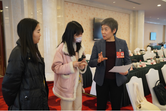 《中国政府采购报》记者张舒慧(右)在北京会议中心采访全国政协委员许礼进。
