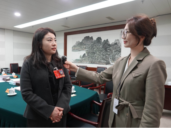 《中国政府采购报》记者马金眈(右)采访全国人大代表、安徽中医药大学第二附属医院副主任医师徐晓婵。