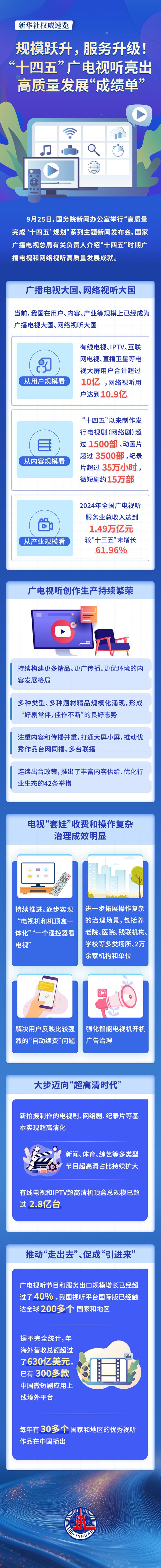 有线电视、IPTV、互联网电视、直播卫星等电视大屏用户合计超过10亿,网络视听用户达到10.9亿;“十四五”以来制作发行电视剧(网络剧)超1500部、动画片超3500部,纪录片超35万小时,微短剧约15万部;2024年全国广电视听服务业总收入达到1.49万亿元……