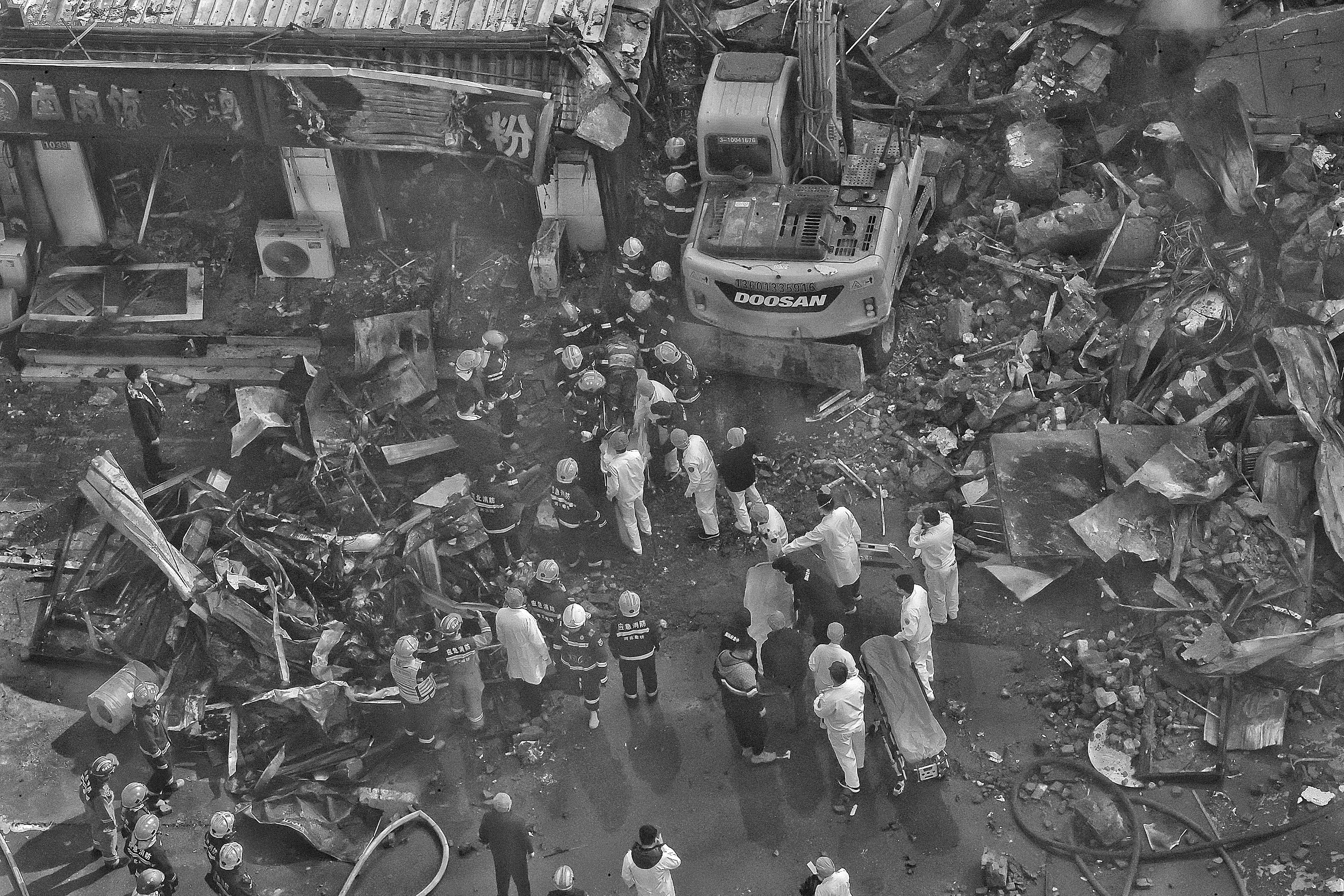 初评评语 (推荐理由) | 作为现场抓拍照片,作品记录了河北燕郊爆燃事故后的紧急救援场景,本身极具震撼力。黑白的画面突显出事故现场的严重性和紧迫感,大量建筑废墟散落一地,左侧可见受损的商铺招牌。画面中央,身着制服的消防人员和身穿白色防护服的救援队员正紧密协作,在瓦砾堆中进行搜救工作。现场还部署了挖掘机和其他专业设备协助清理和救援。从高处俯瞰,这支训练有素的救援队伍展现出惊人的组织能力和专业素养,他们争分夺秒地在废墟中寻找可能的生还者。这张由记者冒险拍摄的独家照片被多家主流媒体刊发,包括中国日报和新京报等,让全国人民第一时间了解到事故现场的真实情况,也彰显了我国应急救灾体系的强大响应能力和专业水平。 | ||||||||||||||