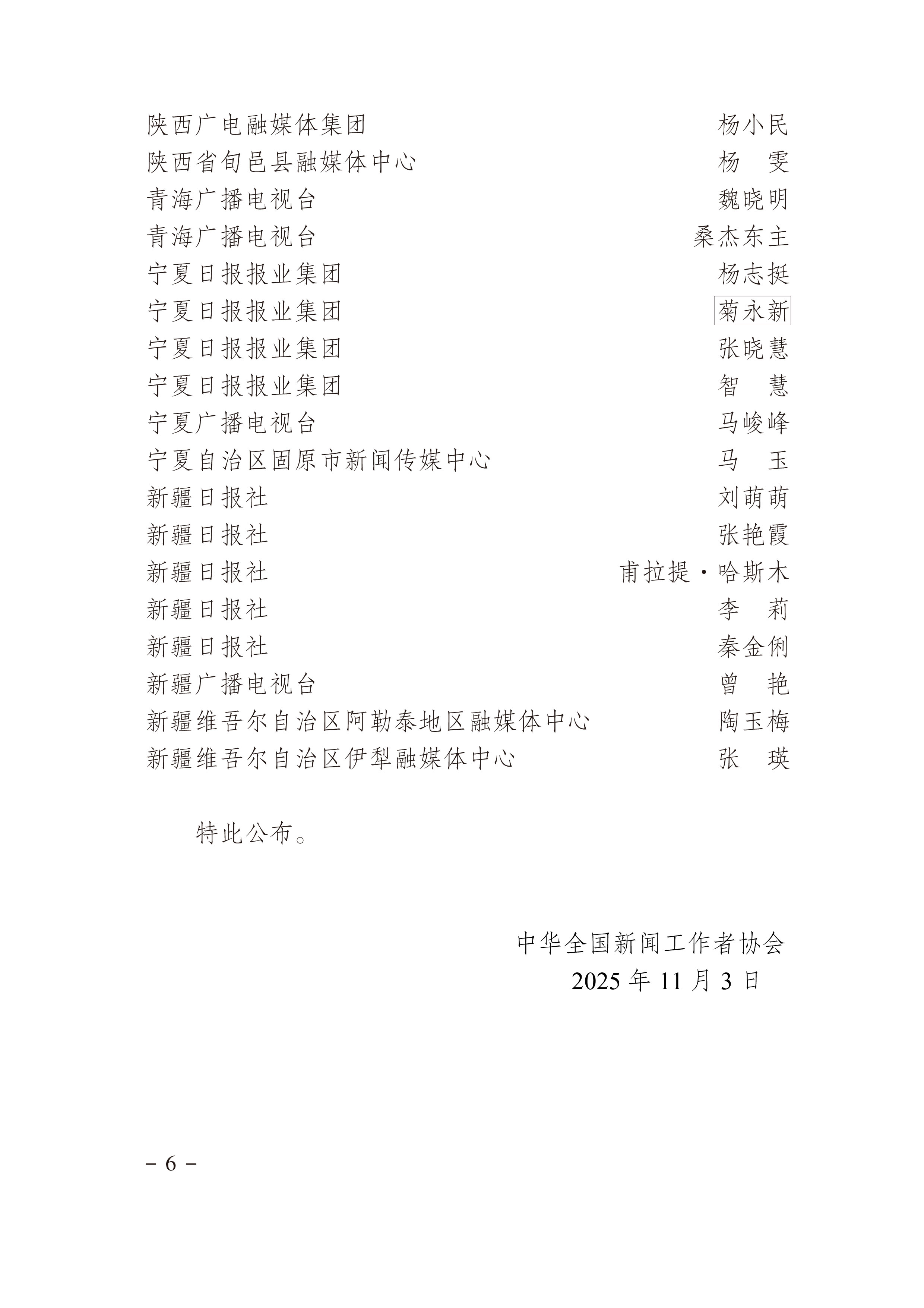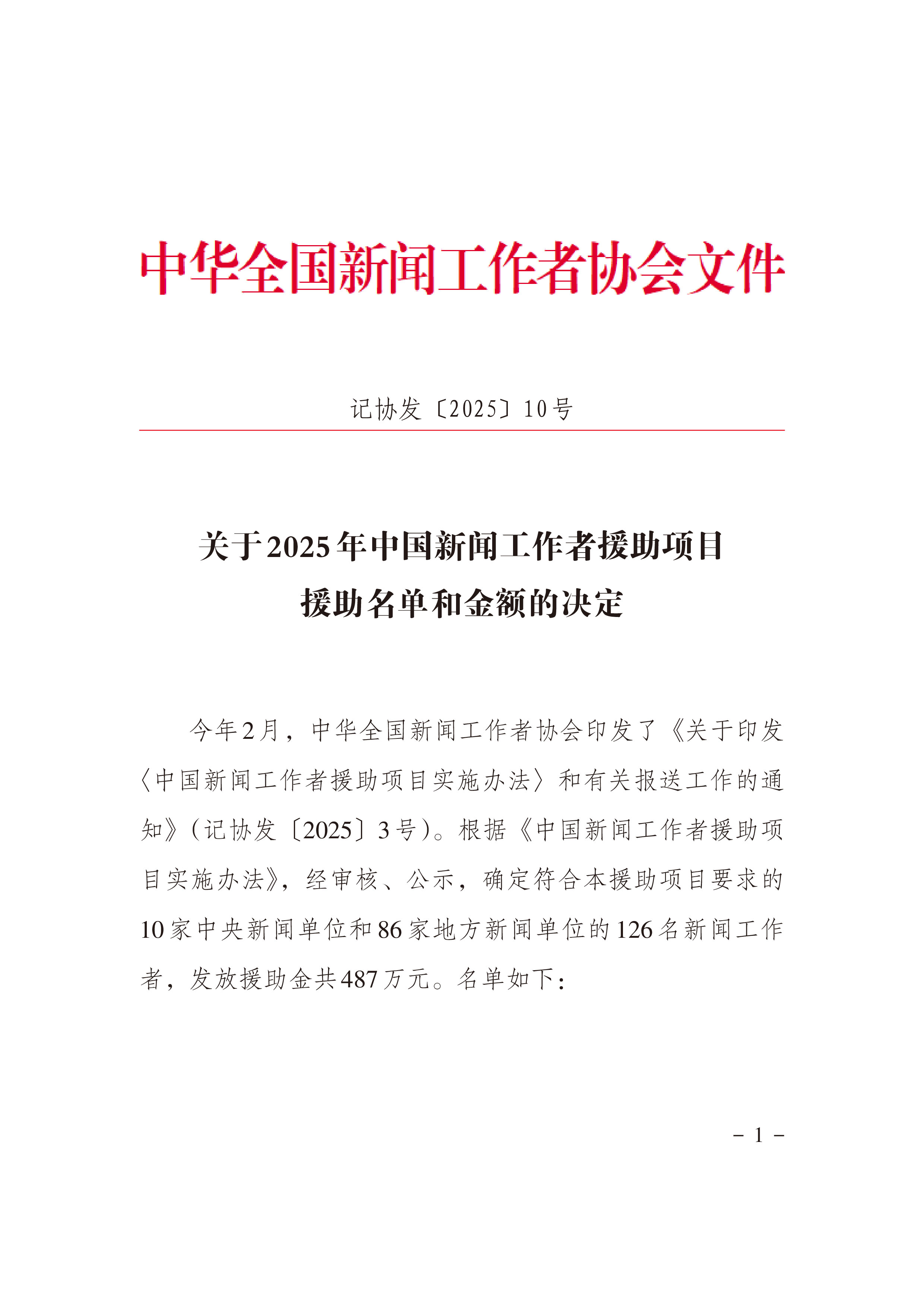 本网讯 今天,中国记协发布2025年中国新闻工作者援助项目援助名单和金额,来自10家中央新闻单位和86家地方新闻单位共126名新闻工作者获援助金487万元。这是中国记协连续第十二年对因履行新闻工作职责殉职、伤残或重病的新闻工作者进行援助。