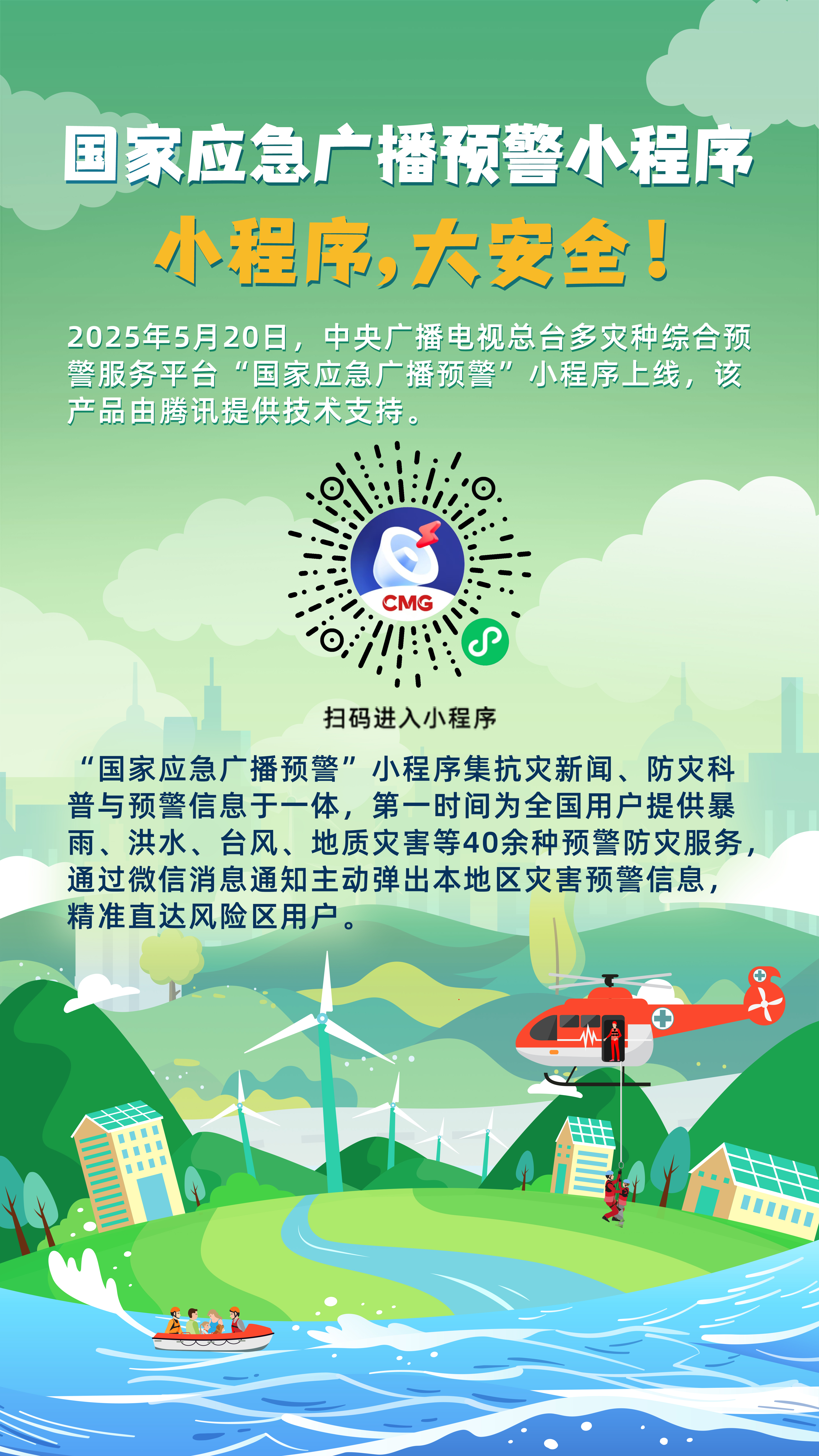 小程序,大安全!“国家应急广播预警”小程序集抗灾新闻、防灾科普与预警信息于一体,第一时间为全国用户提供暴雨、洪水、台风、高温、地质灾害等40余种预警防灾服务,可跨多机型和运营商、基于关注地精准推送,直达风险区用户,构建了“防+学+救”一体的全链条应急信息服务。截至今年9月用户量超46万,累计下发超70万条预警信息。