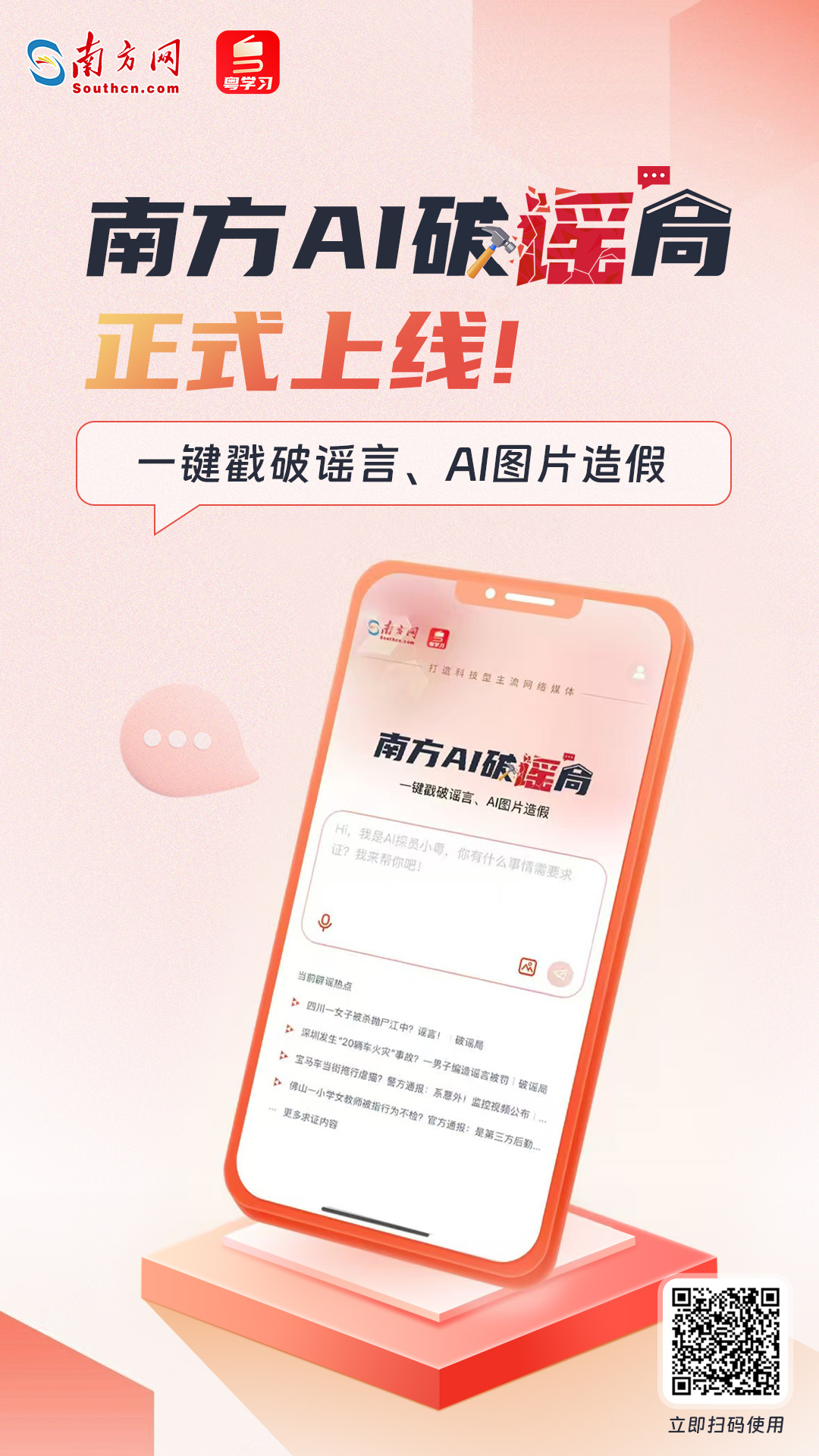 《南方AI破谣局》是全国首款“大模型+新闻数据”辟谣智能体,打破一条稿辟一个谣的低效模式,解决辟谣跑断腿、辟谣不及时、AI图片造假难辨等痛点。