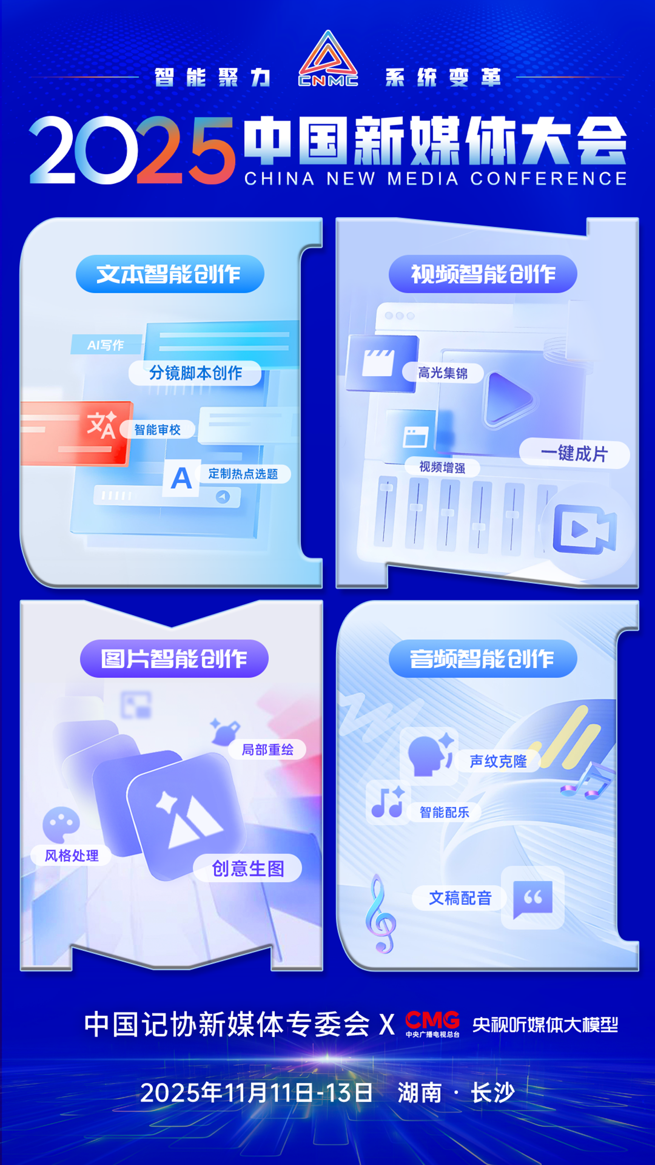2025中国新媒体大会将于11日至13日在湖南长沙召开,中国记协新媒体专业委员会各成员单位纷纷推出“联名海报”为大会预热。