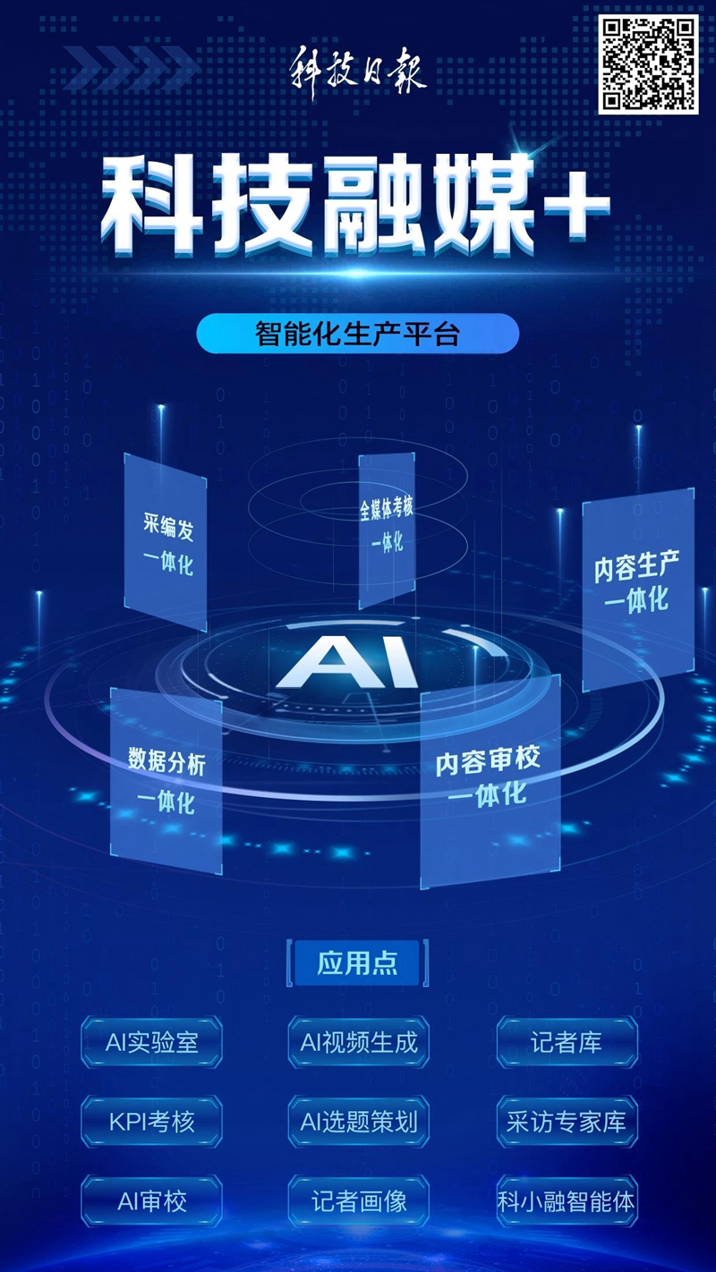 “科技融媒+”智能化生产平台以“智”“融”“用”三级架构为支撑,利用人工智能、大数据等先进技术驱动媒体转型,重构了报社媒体融合发展的技术底座,推动报社媒体系统性变革。将AI技术应用在新闻采集、生产、分发、接收、反馈中,打通媒体业务系统的融通,实现内容生产传播的“一体化”和“智能化”。“科技融媒+”AI选题策划推荐已成为报社每日选题策划会上特有的AI报题环节;AI智能审校已深度融入了报社三审三校流程,为内容质量保驾护航;AI文生图生成的图片已在科技日报上应用。同时自研的KPI考核、科小融智能体、采访专家库等多个应用均已成为报社生产的重要支撑。