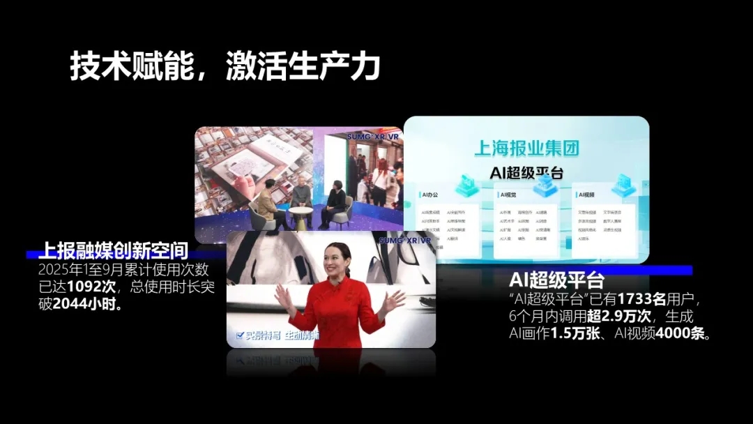 集团努力培育“媒体新质生产力”,集约化建设技术基座,服务转型需求,助力创意落地。“融媒创新空间”提供适应互联网环境下视听内容生产的场景应用,2025年1至9月累计使用次数已达1092次,总使用时长突破2044小时,使用总量是去年的2.5倍。Andy、Alex等国传工作室,都是“融媒创新空间”的常客。上报AI超级平台形成全链条全环节跨场景AI赋能效应,包括集团外宣媒体记者在内,已有1733名用户,6个月内调用超2.9万次,生成AI画作1.5万张、AI视频4000条。