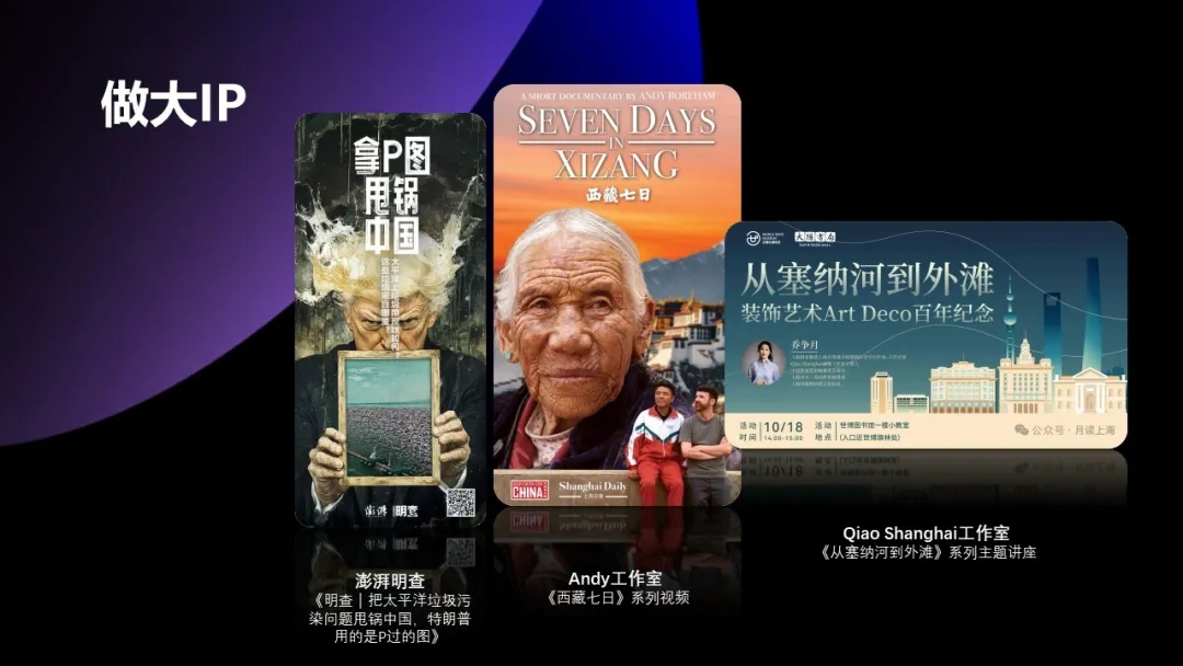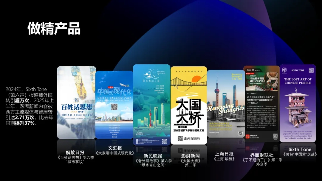 要有能引发跨国界跨文化共鸣的爆款,《上海·焕新》系列视频通过小切口展示习近平文化思想最佳实践地上海样本,海外播放量达2000万次,《北外滩》单集播放量达453万次;要有能破解东西方“信息逆差”的有效输出,2024年,第六声报道被外媒转引超万次,2025年上半年,澎湃新闻内容被西方主流媒体与智库转引达2.71万次,比去年同期提升37%。