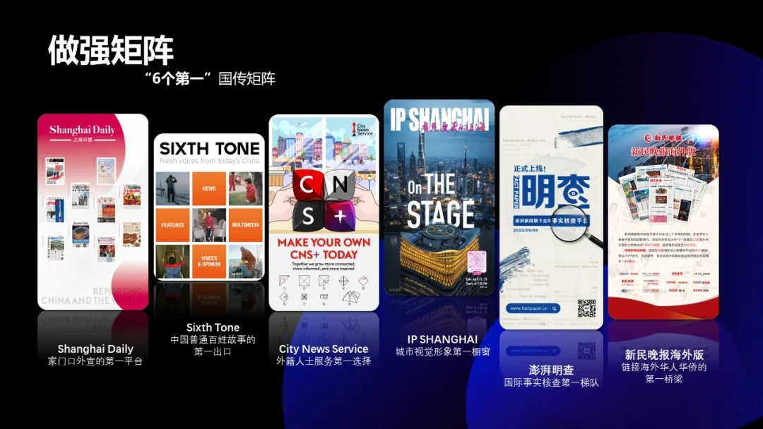 第一份地方性英文日报Shanghai Daily聚焦在沪生活工作的外籍人士及入境游客,打造“家门口外宣的第一平台”;Sixth Tone(第六声)聚焦日常生活中的“小而美”,打造“中国普通百姓故事的第一出口”;City News Service一站式对外信息服务平台致力于成为“外籍人士服务第一选择”;IP SHANGHAI城市形象资源共享平台致力于成为“城市视觉形象第一橱窗”;“澎湃明查”致力于迈入“国际事实核查第一梯队”;新民晚报海外版致力于成为“链接海外华人华侨的第一桥梁”。集团旗下媒体、融媒工作室等拥有脸书、油管、X、INS、TikTok等海外主要社交平台账号73个,10万以上粉丝账号有19个,粉丝总数超过1170万。