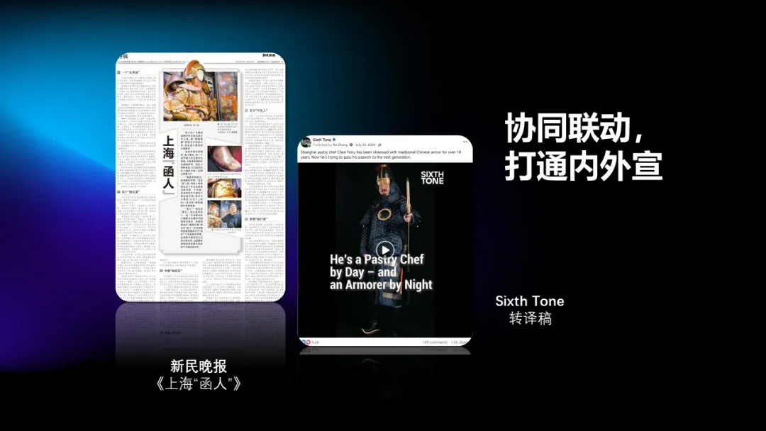 集团于去年7月制定并启动内外宣媒体国传内容协同机制,由国传中心负责统筹协调,内宣媒体负责供稿,外宣媒体负责转译及出海落地,让更多具备国际传播潜力的内宣内容能被海外受众看到。如第六声转译新民晚报图文特稿《上海“函人”》,讲述“函人堂”创始人陈斐孺“复活”中国传奇甲胄的故事,在META、X、Ins总播放量超过22万次。
