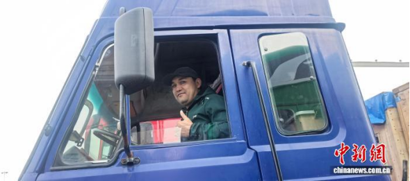 10月29日,哈萨克斯坦货车司机叶尔米克·叶尔肯拜,即将驾驶中国产东风牌货运车前往阿拉木图。中新社记者 陈舒一 摄