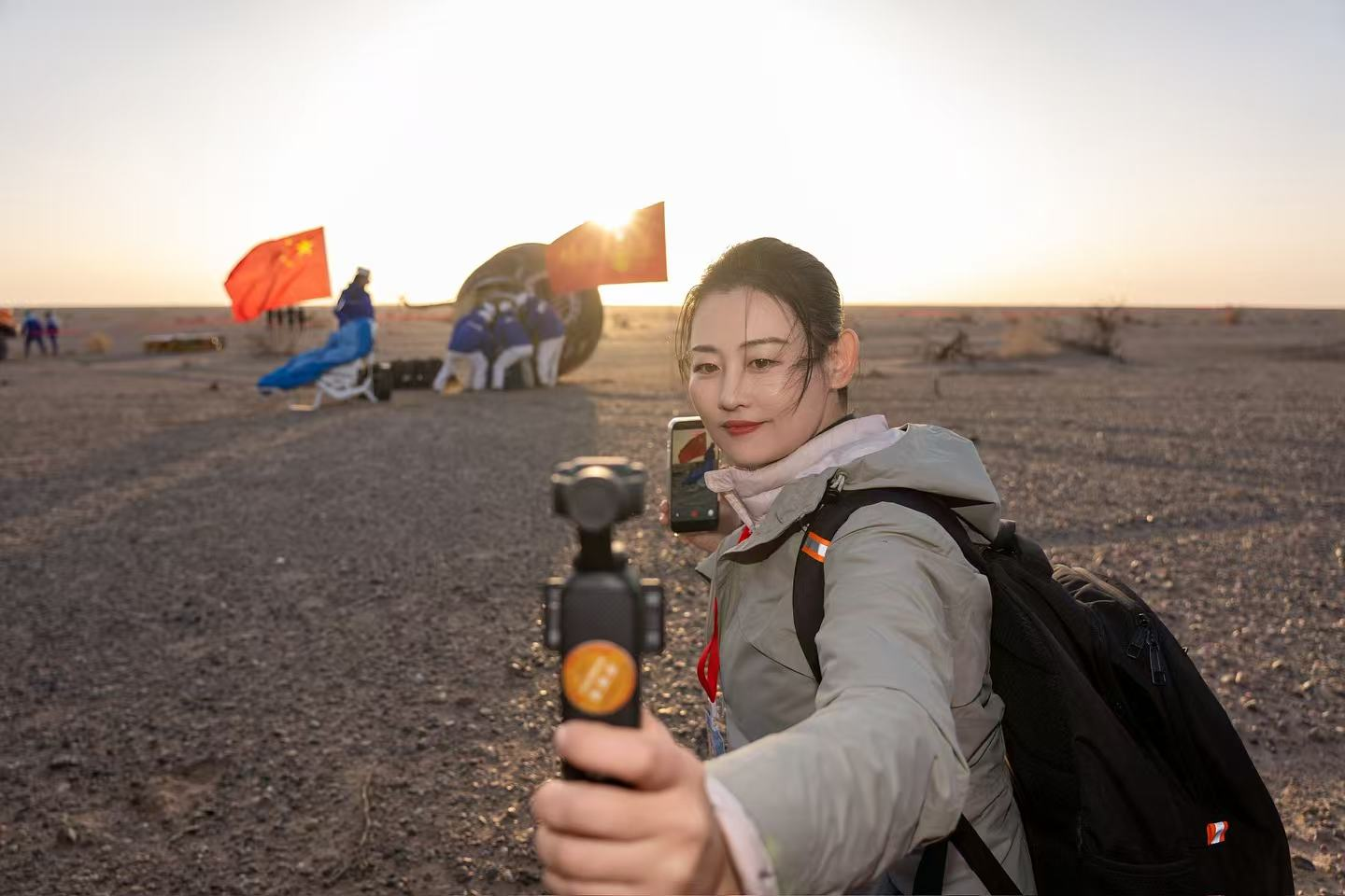 11月14日,在额济纳东风着陆场,神舟二十号航天员乘组平安凯旋,在神舟二十一号载人飞船返回舱着陆现场,内蒙古广播电视台记者邹乌兰正在进行现场报道。