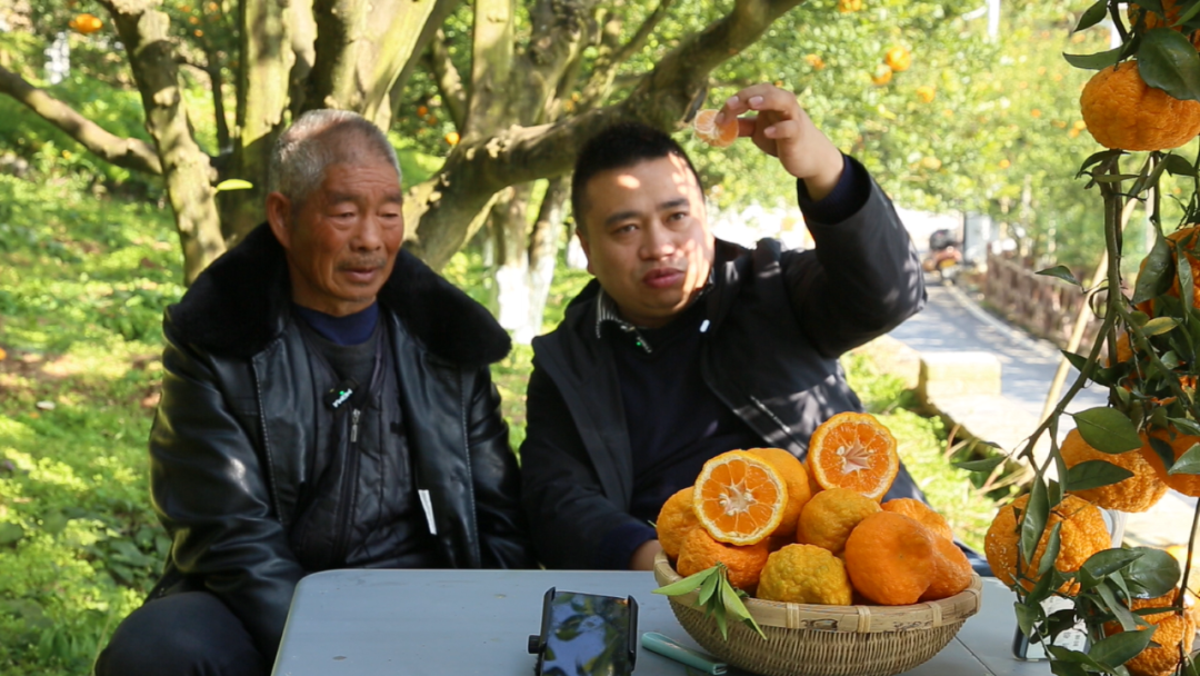 刘记书老人与武绍雷(右一)在自家的狮头柑林内一起直播。