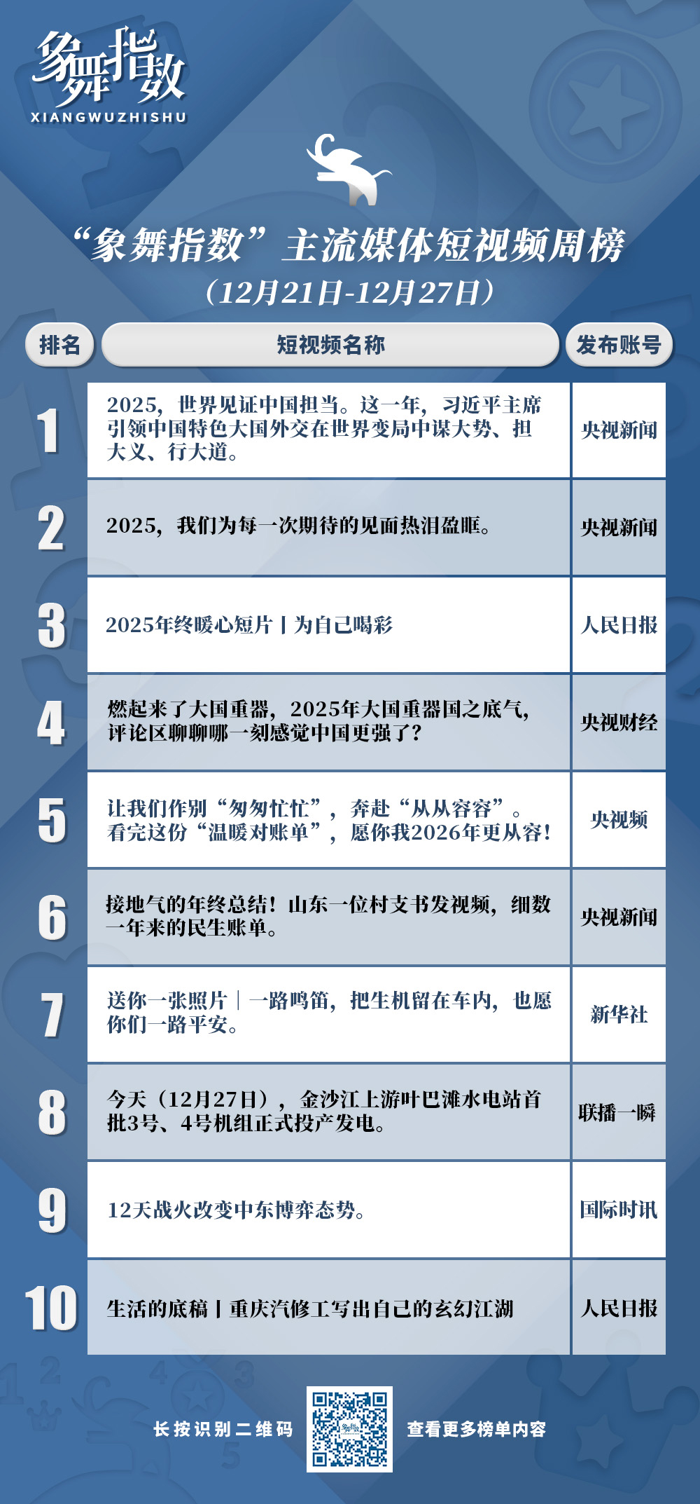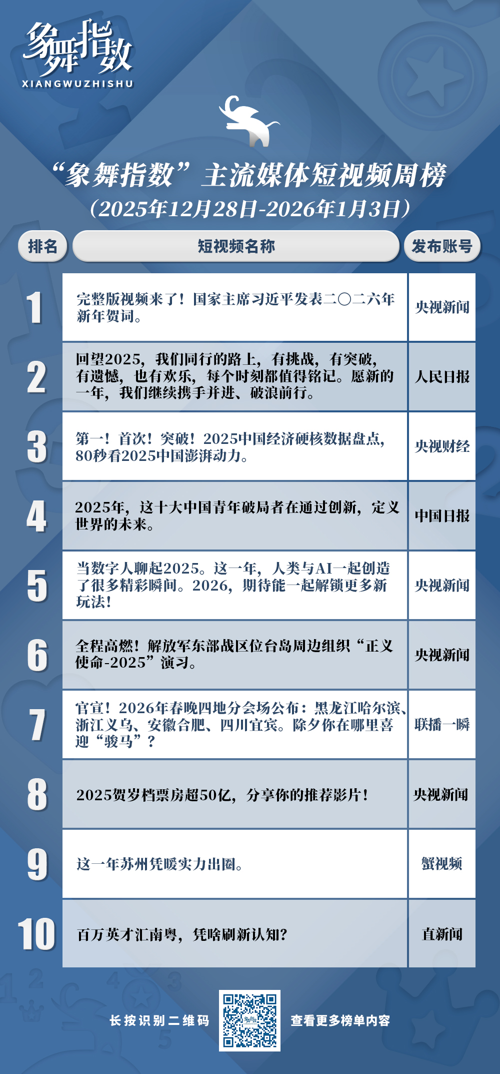 从“象舞指数”短视频榜单上的众多盘点类作品来看,主流媒体对此类作品的把握,不仅技巧愈发娴熟,而且显出扎实的内容底气。从国家大政方针的权威解读到普通人的奋斗故事,从硬核科技的创新突破到城市角落的暖心瞬间,主流媒体盘点类短视频通过立意升维与叙事创新,实现了对大众记忆的深度梳理与时代精神的精准描摹,形成鲜明的年度叙事景观。相关作品以精准的主题立意、多元的叙事角度、创新的表达形态,将宏大叙事与用户微观视角有机融合,既彰显核心价值,又传递情感温度。