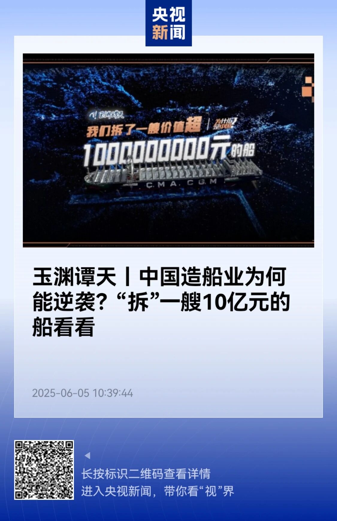 此标题颇具巧思,精准点明“中国造船业韧性发展”的核心立意,通过“拆”船的“破坏性”动作与“10亿元”的惊人数字形成双重吸引,凸显了这条新闻的独特报道视角:跳出传统叙事框架,以非常规的切入点,将硬核工业议题成功拆解为大众可感知的趣味探索。