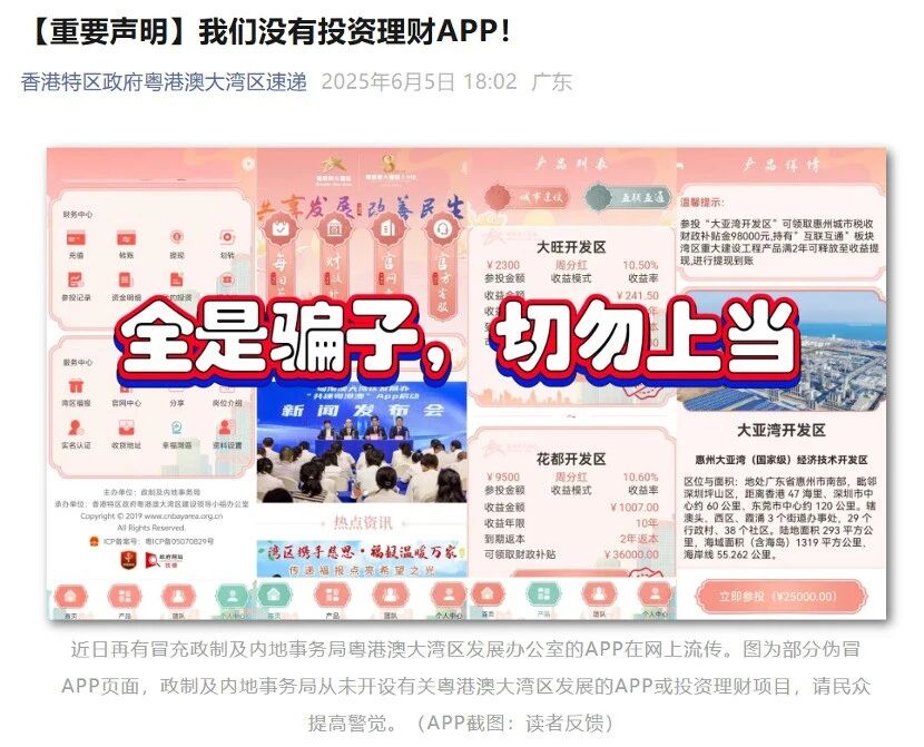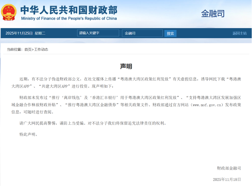 2025年11月18日,财政部金融司的一则声明引起我的注意:有不法分子伪造财政部公文,在社交媒体传播“粤港澳大湾区政策红利发放”虚假信息,诱导网民下载“粤港澳大湾区App”“共建大湾区App”进行投资。