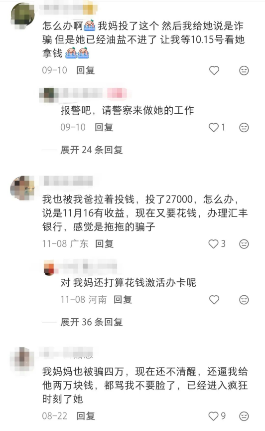 在社交平台搜索“粤港澳大湾区App”“共建大湾区App”,会发现大量网友分享家人被骗经历的帖子,标题通常带着“别信”“紧急提醒”“家人被洗脑了”“惊天骗局”等字眼。许多网友留言:“家人已深陷其中”“投入金额从几万到几十万不等”“受害者多为中老年人”。