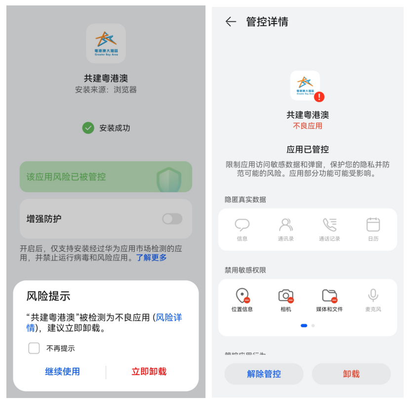 调查过程中,我找到了图标相同、名称相似的“共建粤港澳App”“共建粤港澳大湾区App”。一点击安装,手机就弹出“‘共建粤港澳’被检测为不良应用,建议立即卸载”的风险提示。安装完后,页面内容显示空白,看不到投资产品信息。