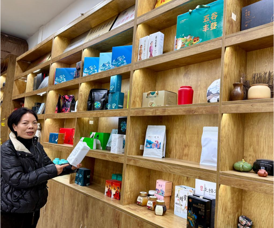 来到村民刘海燕的茶叶公司,货架上,各类茶产品琳琅满目。53岁的刘海燕手脚利落,说话带着创业者的爽快。