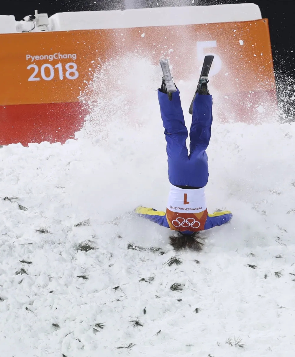 2018年2月16日,徐梦桃在平昌冬奥会自由式滑雪女子空中技巧决赛中发生失误。新华社记者 李钢 摄