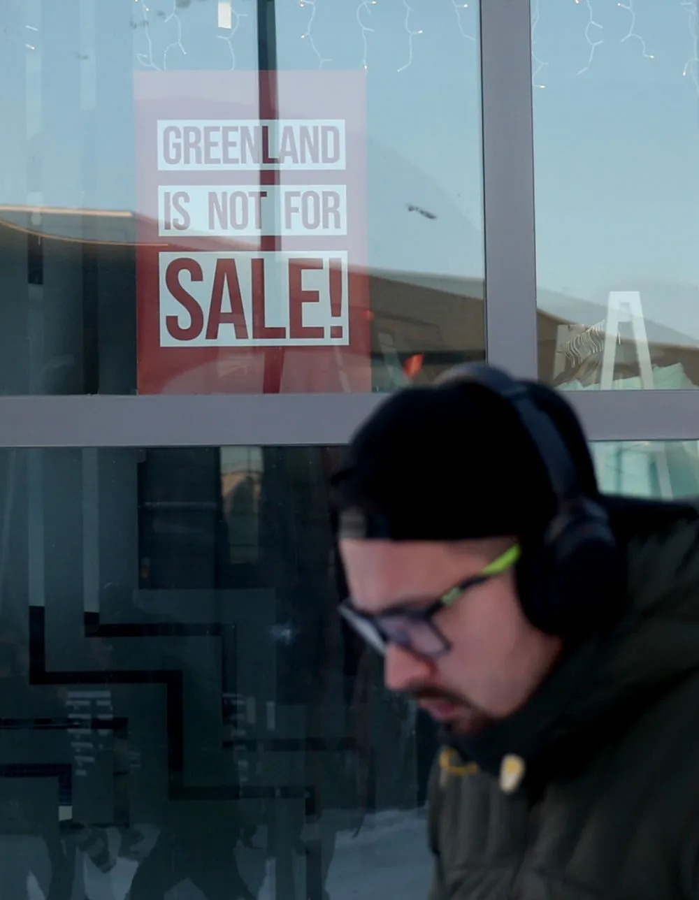 2月8日,在丹麦自治领地格陵兰岛首府努克,一名男子走过商铺橱窗上贴着的“格陵兰岛不出售”标语。新华社记者 李颖 摄