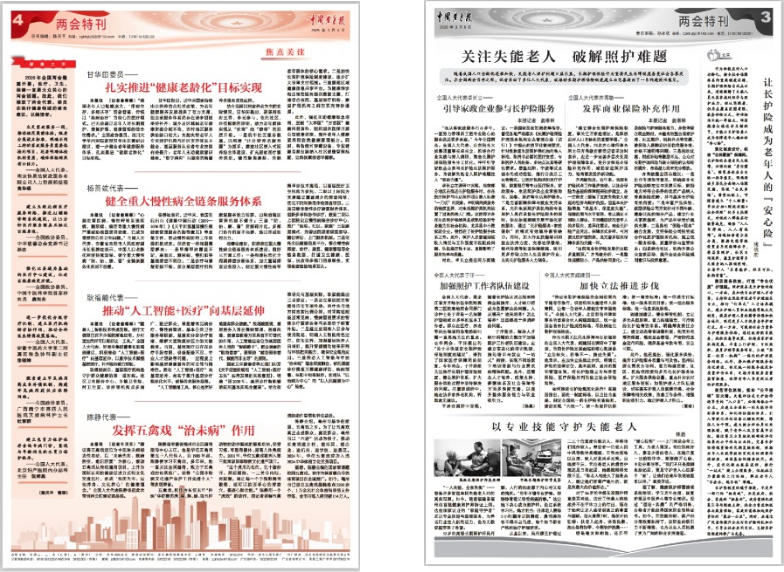 中国老年报聚焦关爱失能老人、养老照护体系、医疗卫生服务等老年群体关注的热点议题,推出《关注失能老人 破解照护难题》《两会健康之声》等专版,深入解读惠老政策、传递民生温度。