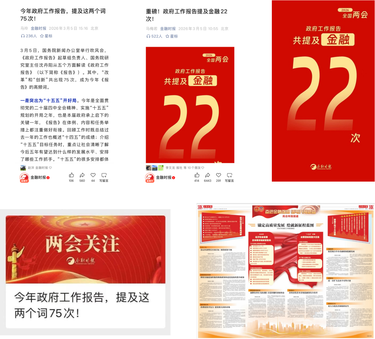 各行业类媒体发挥立足行业、服务企业、贴近产业的优势,深入解读政府工作报告。金融时报提炼“经济增长目标”等8个核心金融关键词,推出《今年政府工作报告,提及这两个词75次!》等融媒产品,配合《今年目标》《十大任务明确》等图解产品,“文字+图解”简洁明快,吸引受众,总阅读量迅速突破10万。