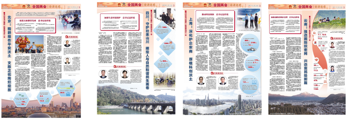 中国海关传媒中心围绕“新质生产力”“高水平对外开放”等关键词,采访南京海关等12个单位,刊发《深学细悟凝共识 实干奋进勇担当——习近平总书记在参加江苏代表团审议时的重要讲话在海关引发热烈反响》。人民公安报以整版篇幅推出“牢记总书记嘱托·挺膺担当这一年”系列报道,围绕公安机关贯彻落实习近平总书记在北京、四川等地考察时重要讲话精神,展现公安干警立足职责使命、推动工作落实落地的成果成效。