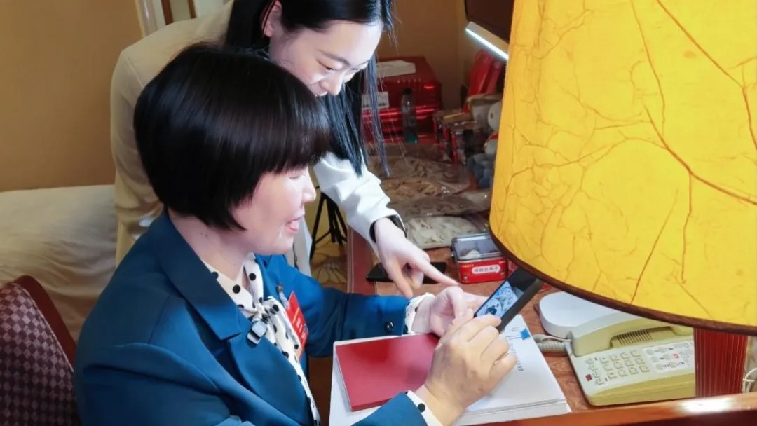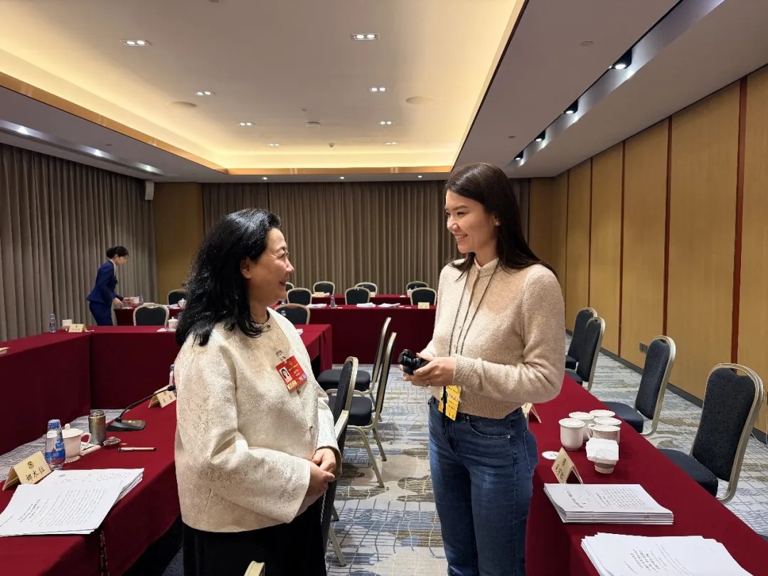 3月8日,总台民族语言记者古丽巴合夏(右)采访全国政协委员。