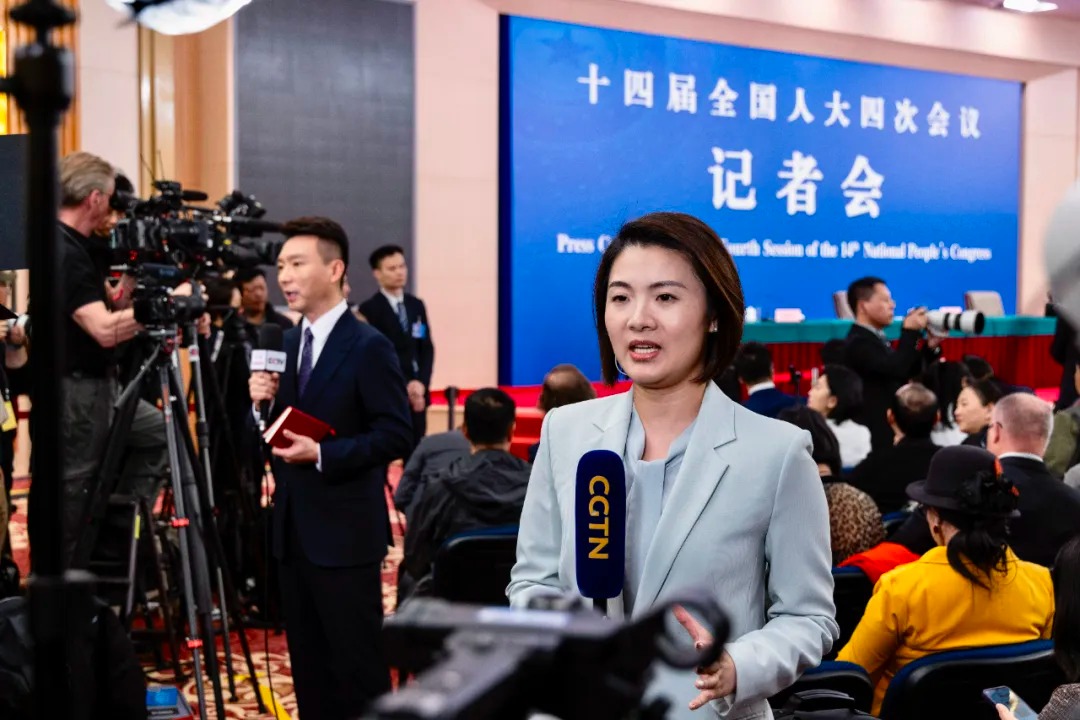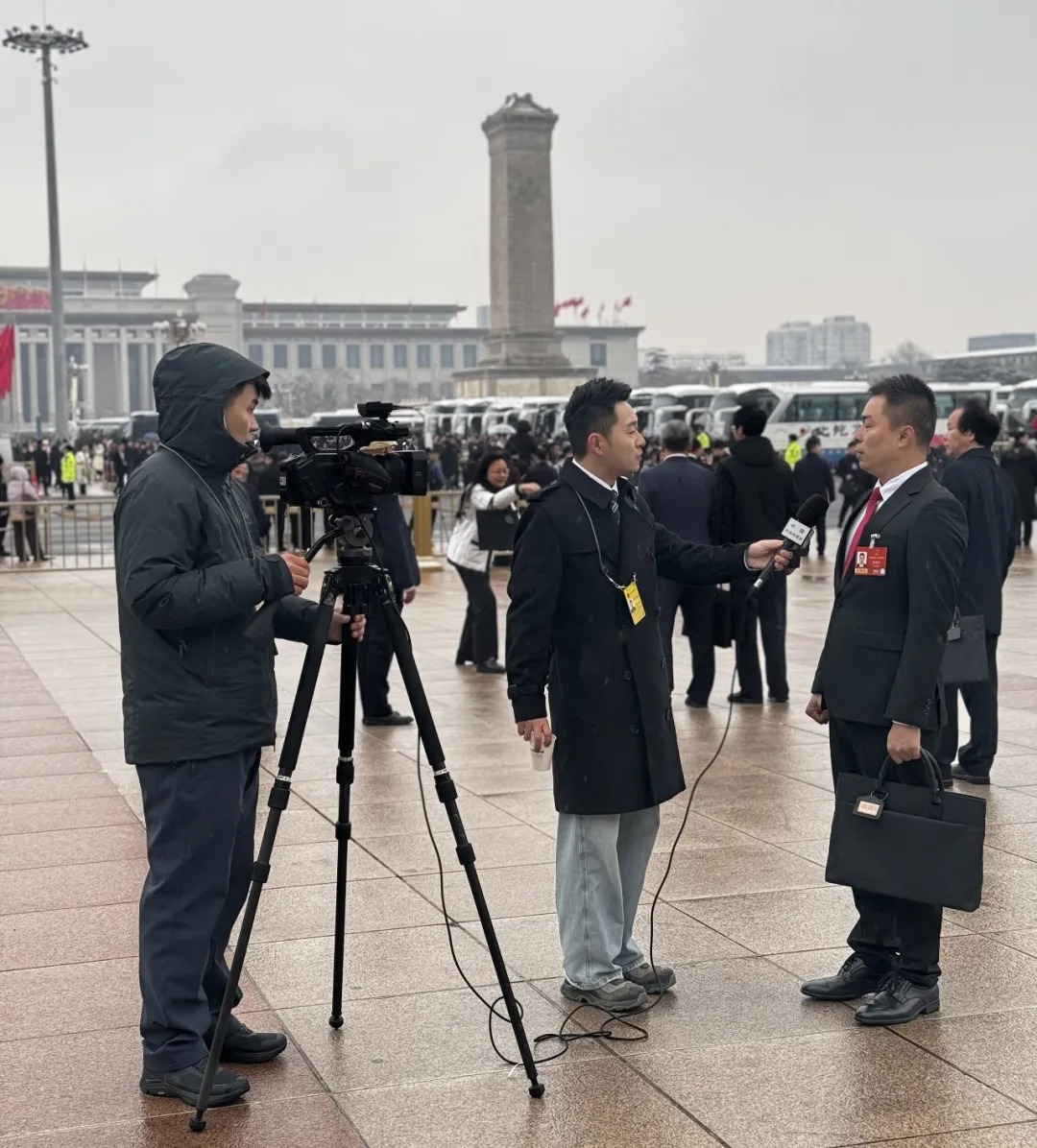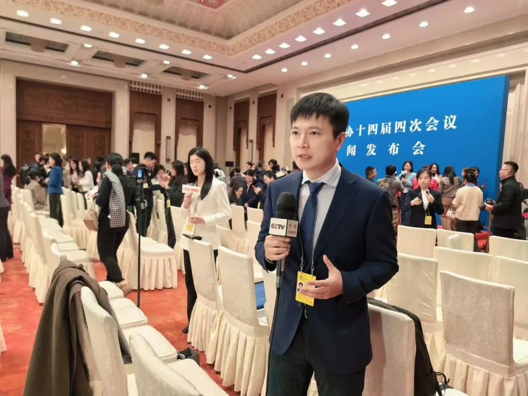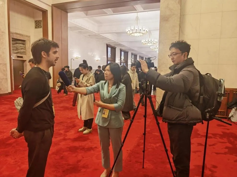 3月5日,央视中文国际频道记者骆魏、苏龙臻采访全国人大代表。