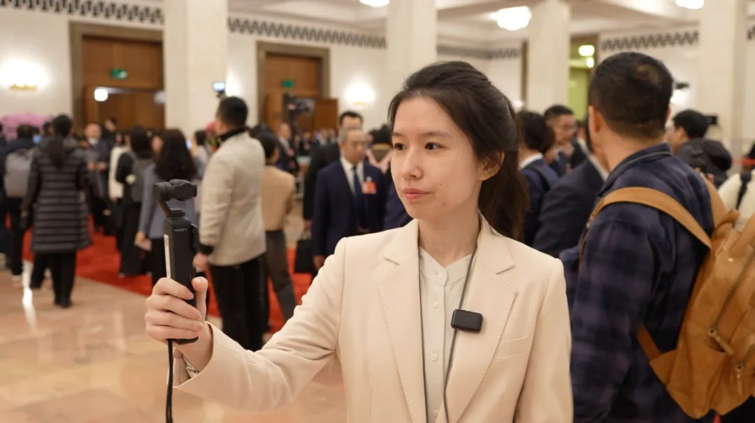 3月5日,央视新闻频道记者董怀文在人民大会堂“代表通道”报道。