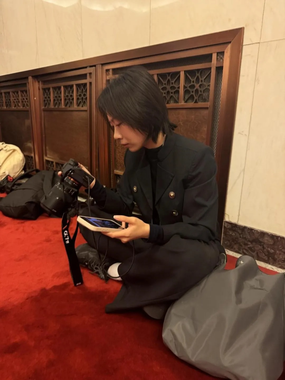 3月3日,国际在线记者胡晓薇在会场外挑选照片。