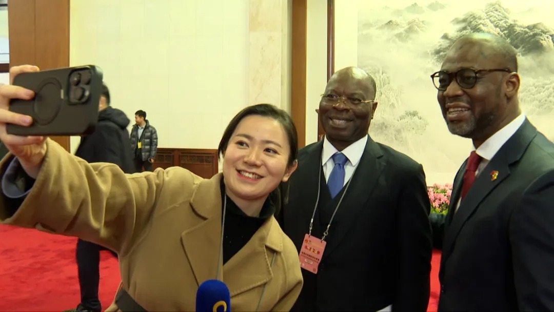 3月5日,CGTN法语记者张善辉在人大开幕会后采访加蓬、贝宁驻华大使。