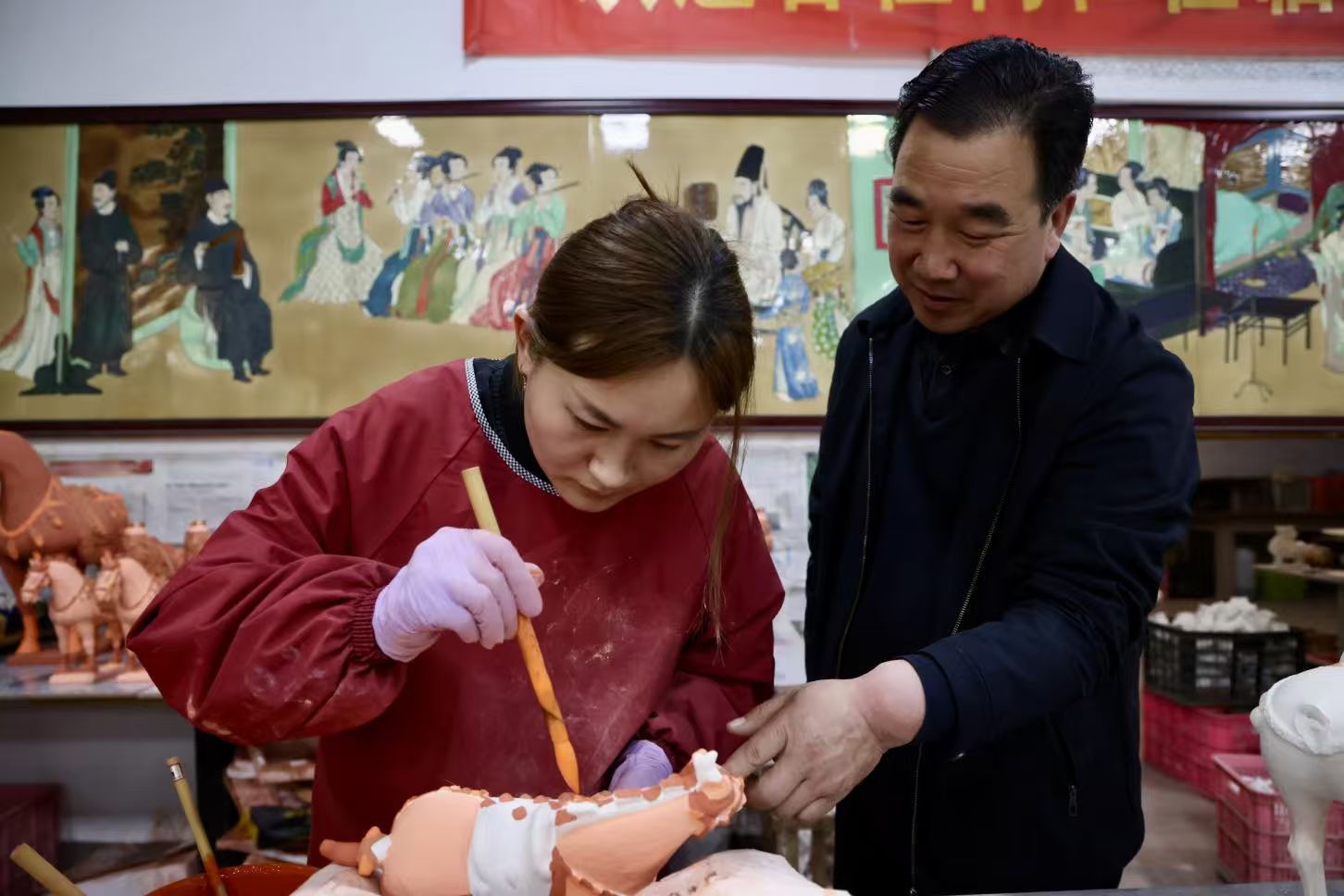 4月2日下午,聋哑人卫雪丽在肢体伤残的国家级非遗传承人高建强指导下制作唐三彩